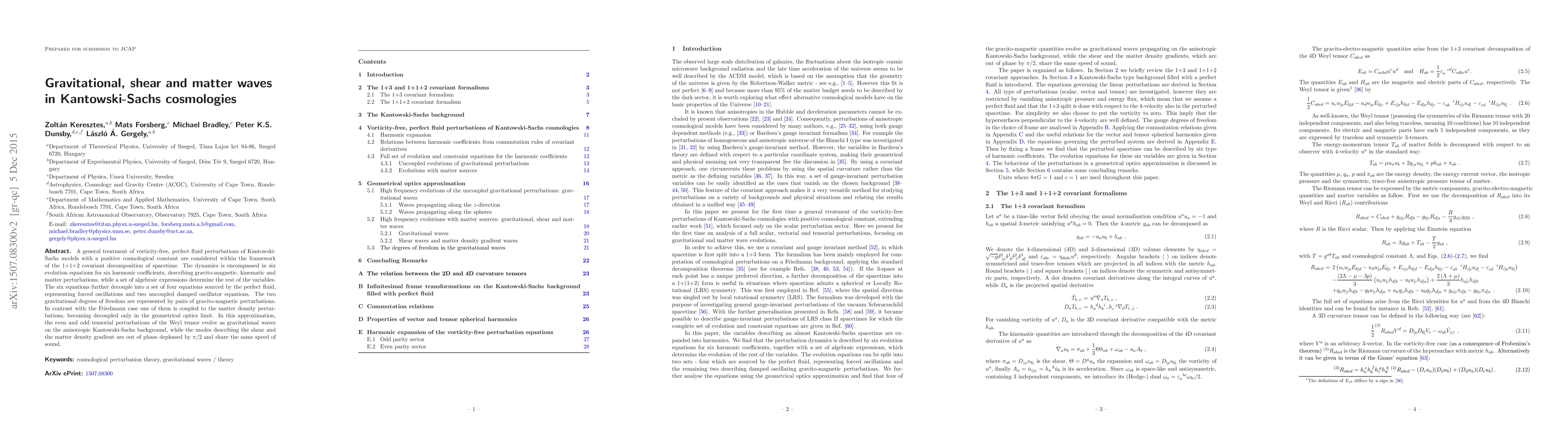 This research explores vorticity-free, perfect fluid perturbations in Kantowski-Sachs cosmologies with a positive cosmological constant, revealing the dynamics of gravito-magnetic, kinematic, and matter perturbations through a set of six evolution equations. The study finds that gravitational degrees of freedom are represented by coupled gravito-magnetic perturbations, differing from the Friedmann case, and highlights the behavior of gravitational waves and shear modes in the geometrical optics limit.