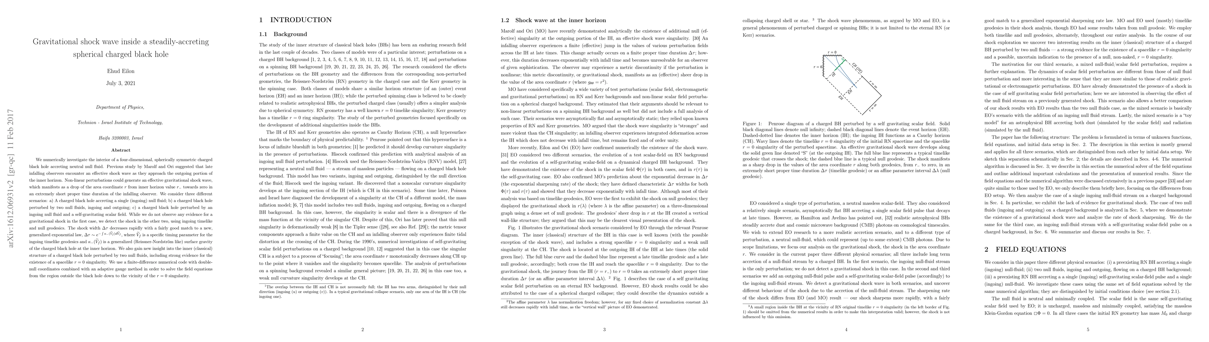 This research numerically explores the interior of a charged, four-dimensional black hole accreting null fluid, finding evidence of gravitational shock waves in scenarios involving perturbations by two null fluids or an ingoing null fluid and a scalar field. The shock width is shown to follow a generalized exponential law.