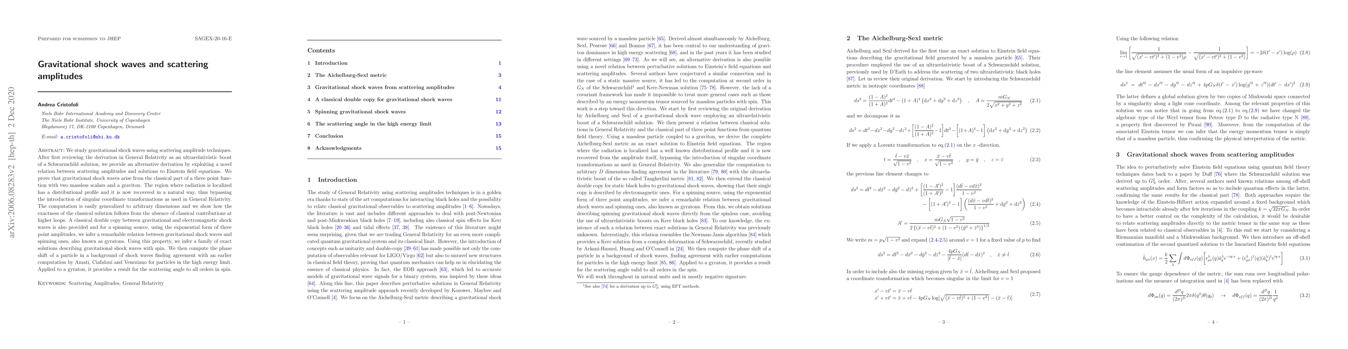 We study gravitational shock waves using scattering amplitude techniques. After first reviewing the derivation in General Relativity as an ultrarelativistic boost of a Schwarzschild solution, we provide an alternative derivation by exploiting a novel relation between scattering amplitudes and solutions to Einstein's field equations. We prove that gravitational shock waves arise from the classical part of a three point function with two massless scalars and a graviton. The region where radiation is localized has a distributional profile and it is now recovered in a natural way, thus bypassing the introduction of singular coordinate transformations as used in General Relativity. The computation is easily generalized to arbitrary dimensions and we show how the exactness of the classical solution follows from the absence of classical contributions at higher loops. A classical double copy between gravitational and electromagnetic shock waves is also provided and for a spinning source, using the exponential form of three point amplitudes, we infer a remarkable relation between gravitational shock waves and spinning ones, also known as gyratons. Using this property, we infer a family of exact solutions describing gravitational shock waves with spin. We then compute the phase shift of a particle in a background of shock waves finding agreement with an earlier computation by Amati, Ciafaloni and Veneziano for particles in the high energy limit. Applied to a gyraton, it provides a result for the scattering angle to all orders in spin.