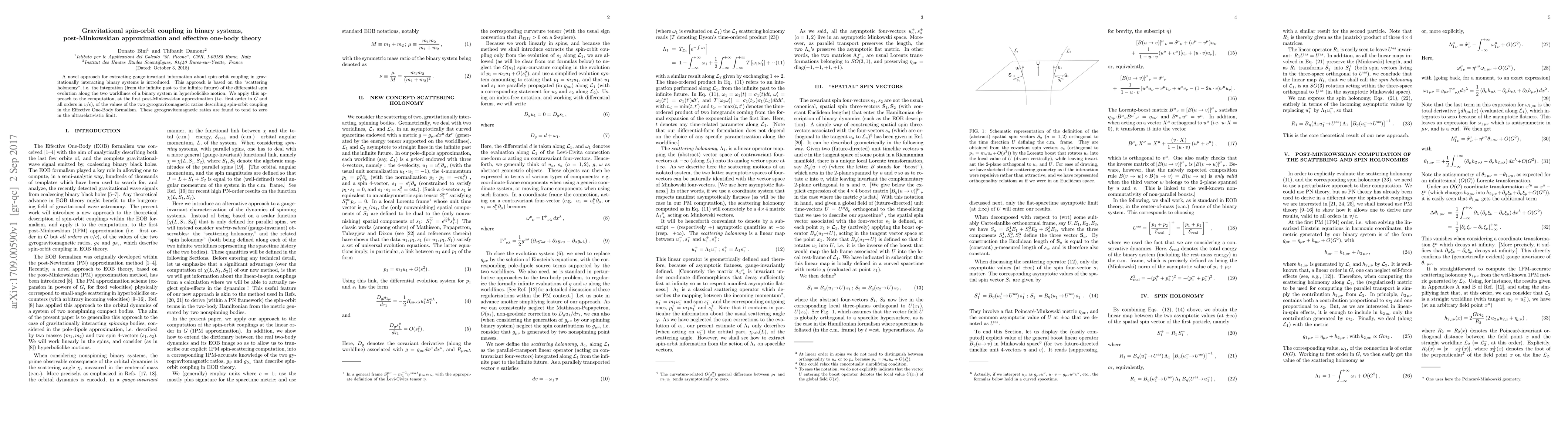 A novel approach for extracting gauge-invariant information about spin-orbit coupling in gravitationally interacting binary systems is introduced. This approach is based on the "scattering holonomy", i.e. the integration (from the infinite past to the infinite future) of the differential spin evolution along the two worldlines of a binary system in hyperboliclike motion. We apply this approach to the computation, at the first post-Minkowskian approximation (i.e. first order in $G$ and all orders in $v/c$), of the values of the two gyrogravitomagnetic ratios describing spin-orbit coupling in the Effective One-Body formalism. These gyrogravitomagnetic ratios are found to tend to zero in the ultrarelativistic limit.