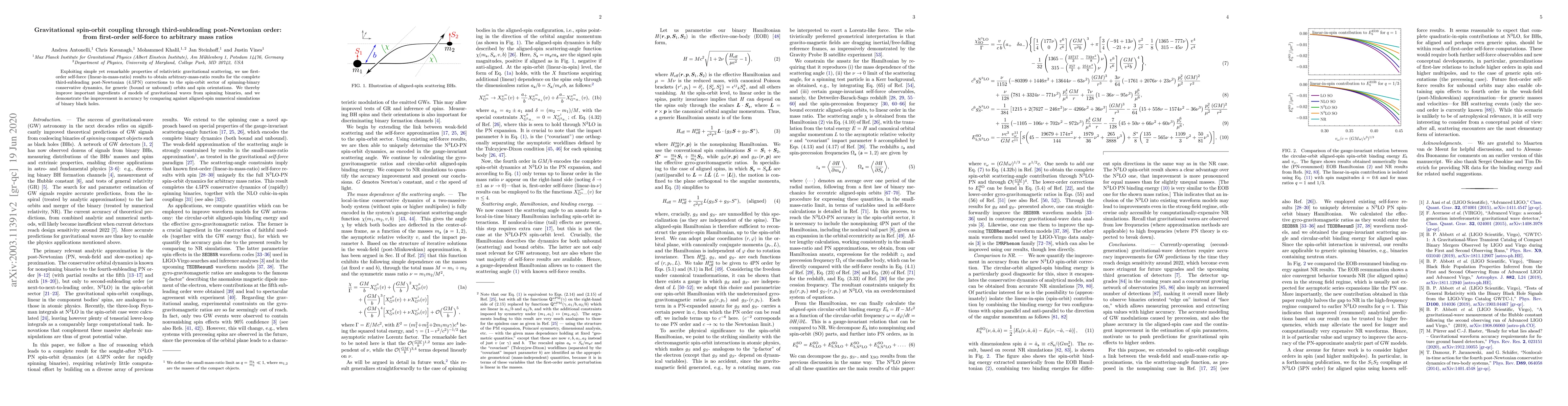 This paper derives third-subleading post-Newtonian (4.5PN) corrections for gravitational spin-orbit coupling in spinning binaries, leveraging first-order self-force results for arbitrary mass ratios. The improved model enhances the accuracy of gravitational wave predictions from spinning binaries, validated through comparison with numerical simulations.