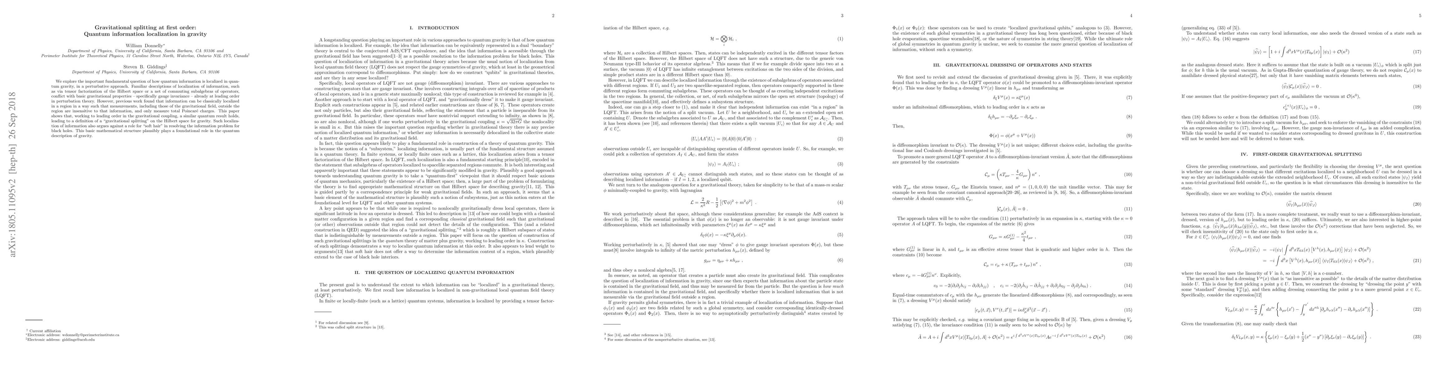 We explore the important fundamental question of how quantum information is localized in quantum gravity, in a perturbative approach. Familiar descriptions of localization of information, such as via tensor factorization of the Hilbert space or a net of commuting subalgebras of operators, conflict with basic gravitational properties -- specifically gauge invariance -- already at leading order in perturbation theory. However, previous work found that information can be classically localized in a region in a way such that measurements, including those of the gravitational field, outside the region are insensitive to that information, and only measure total Poincare charges. This paper shows that, working to leading order in the gravitational coupling, a similar quantum result holds, leading to a definition of a "gravitational splitting" on the Hilbert space for gravity. Such localization of information also argues against a role for "soft hair" in resolving the information problem for black holes. This basic mathematical structure plausibly plays a foundational role in the quantum description of gravity.
