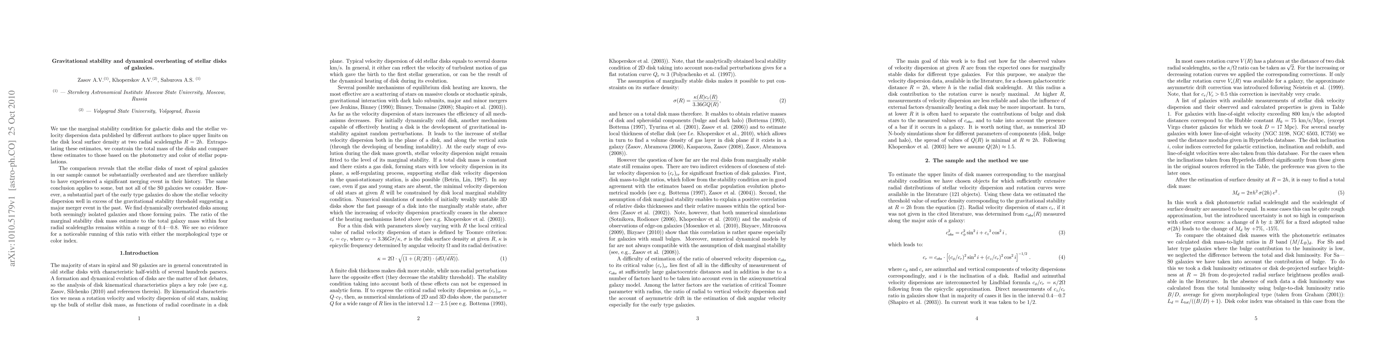 We use the marginal stability condition for galactic disks and the stellar velocity dispersion data published by different authors to place upper limits on the disk local surface density at two radial scalelengths $R=2h$. Extrapolating these estimates, we constrain the total mass of the disks and compare these estimates to those based on the photometry and color of stellar populations. The comparison reveals that the stellar disks of most of spiral galaxies in our sample cannot be substantially overheated and are therefore unlikely to have experienced a significant merging event in their history. The same conclusion applies to some, but not all of the S0 galaxies we consider. However, a substantial part of the early type galaxies do show the stellar velocity dispersion well in excess of the gravitational stability threshold suggesting a major merger event in the past. We find dynamically overheated disks among both seemingly isolated galaxies and those forming pairs. The ratio of the marginal stability disk mass estimate to the total galaxy mass within four radial scalelengths remains within a range of 0.4---0.8. We see no evidence for a noticeable running of this ratio with either the morphological type or color index.