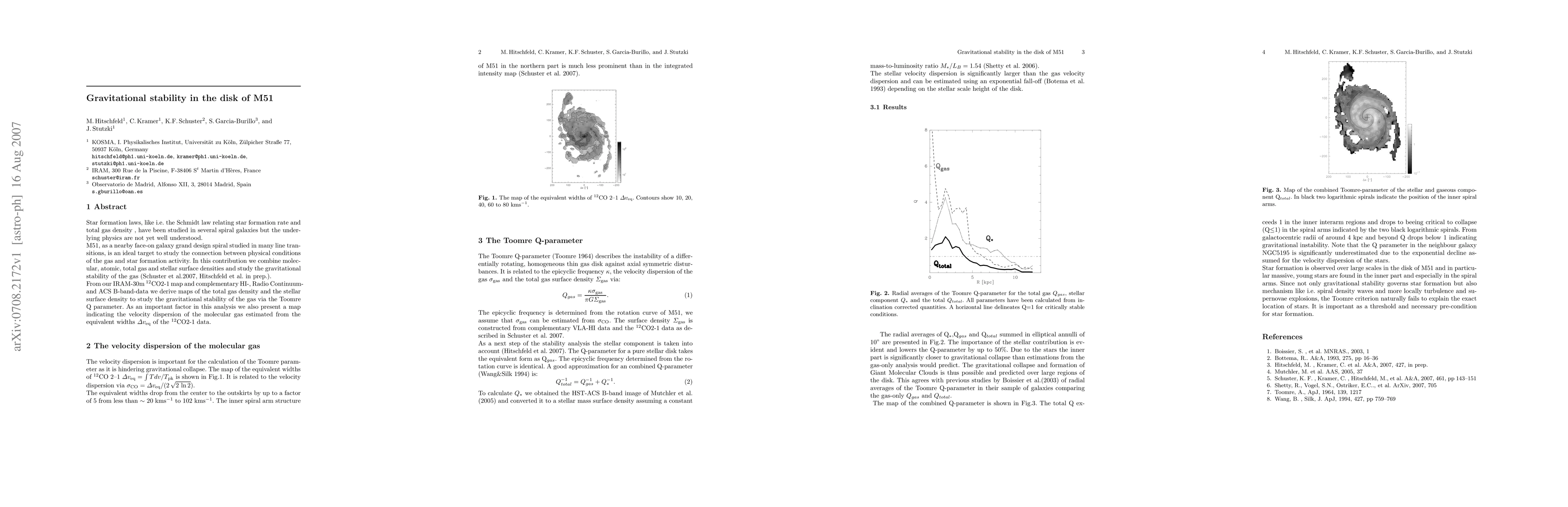 This study uses data from M51, a nearby spiral galaxy, to investigate the relationship between gas conditions and star formation. By combining molecular, atomic, and total gas density with stellar surface density data, the researchers calculate the gravitational stability of the gas using the Toomre Q parameter. The methodology involves using IRAM-30m 12 CO2-1 maps, HI-data, Radio Continuum-data, and ACS-HST B-band-data.