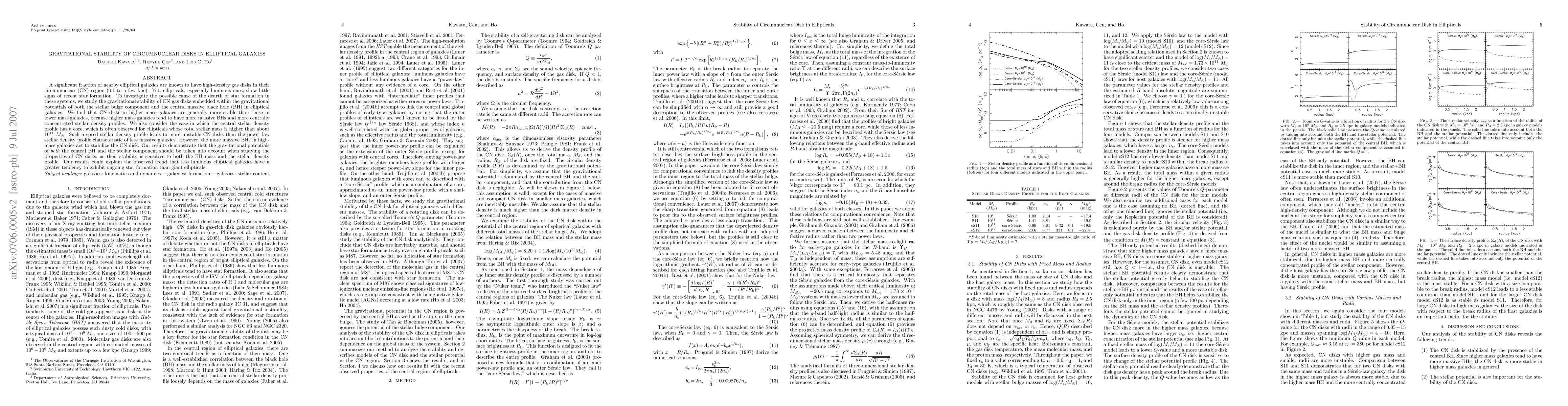 The gravitational stability of circumnuclear disks in elliptical galaxies is influenced by both central massive black holes and stellar density profiles, with more massive BHs stabilizing disks in higher mass galaxies.