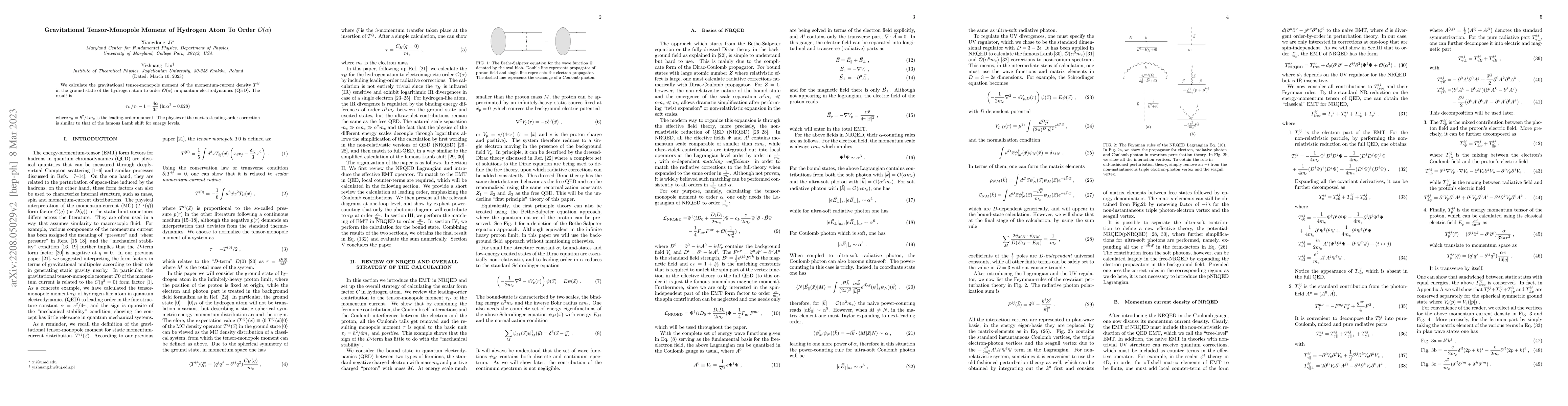 We calculate the gravitational tensor-monopole moment of the momentum-current density $T^{ij}$ in the ground state of the hydrogen atom to order ${\cal O}(\alpha)$ in quantum electrodynamics (QED). The result is \begin{align} \tau_H/\tau_0 - 1 = \frac{4\alpha}{3\pi}\left(\ln\alpha^2-0.028\right) \nonumber \end{align} where $\tau_0= \hbar^2/4m_e$ is the leading-order moment. The physics of the next-to-leading-order correction is similar to that of the famous Lamb shift for energy levels.