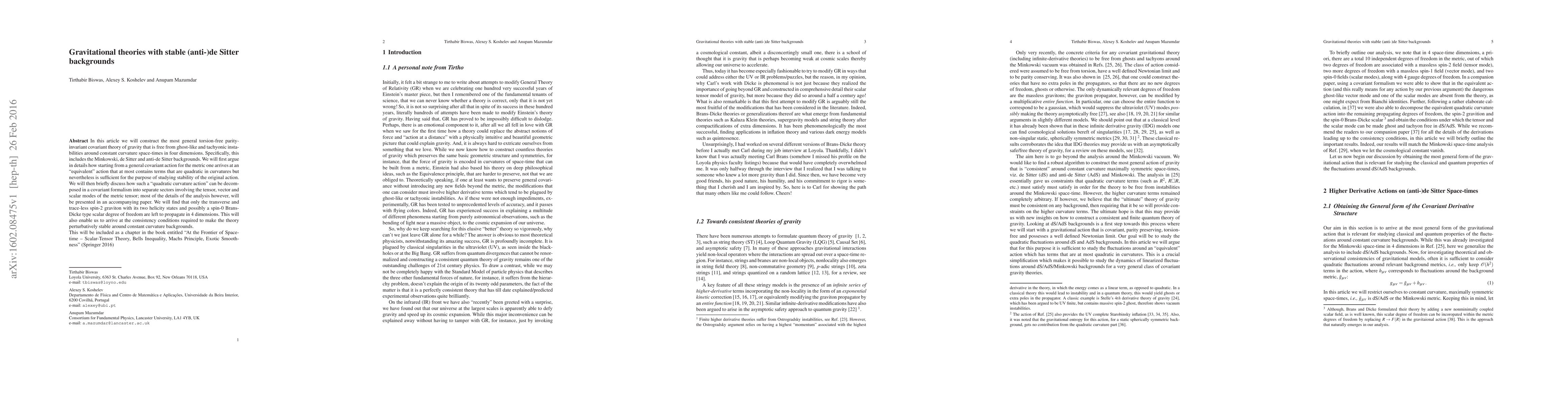 In this article we will construct the most general torsion-free parity-invariant covariant theory of gravity that is free from ghost-like and tachyonic nstabilities around constant curvature space-times in four dimensions. Specifically, this includes the Minkowski, de Sitter and anti-de Sitter backgrounds. We will first argue in details how starting from a general covariant action for the metric one arrives at an "equivalent" action that at most contains terms that are quadratic in curvatures but nevertheless is sufficient for the purpose of studying stability of the original action. We will then briefly discuss how such a "quadratic curvature action" can be decomposed in a covariant formalism into separate sectors involving the tensor, vector and scalar modes of the metric tensor; most of the details of the analysis however, will be presented in an accompanying paper. We will find that only the transverse and trace-less spin-2 graviton with its two helicity states and possibly a spin-0 Brans-Dicke type scalar degree of freedom are left to propagate in 4 dimensions. This will also enable us to arrive at the consistency conditions required to make the theory perturbatively stable around constant curvature backgrounds. This will be included as a chapter in the book entitled "At the Frontier of Spacetime - Scalar-Tensor Theory, Bells Inequality, Machs Principle, Exotic Smoothness" (Springer 2016)