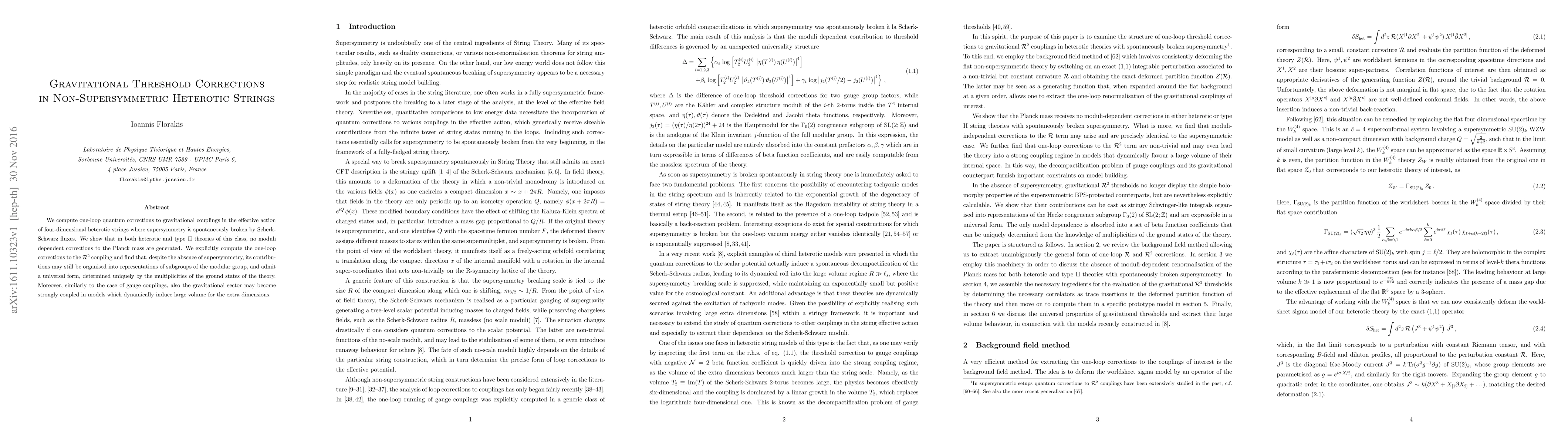 We compute one-loop quantum corrections to gravitational couplings in the effective action of four-dimensional heterotic strings where supersymmetry is spontaneously broken by Scherk-Schwarz fluxes. We show that in both heterotic and type II theories of this class, no moduli dependent corrections to the Planck mass are generated. We explicitly compute the one-loop corrections to the $\mathcal R^2$ coupling and find that, despite the absence of supersymmetry, its contributions may still be organised into representations of subgroups of the modular group, and admit a universal form, determined uniquely by the multiplicities of the ground states of the theory. Moreover, similarly to the case of gauge couplings, also the gravitational sector may become strongly coupled in models which dynamically induce large volume for the extra dimensions.