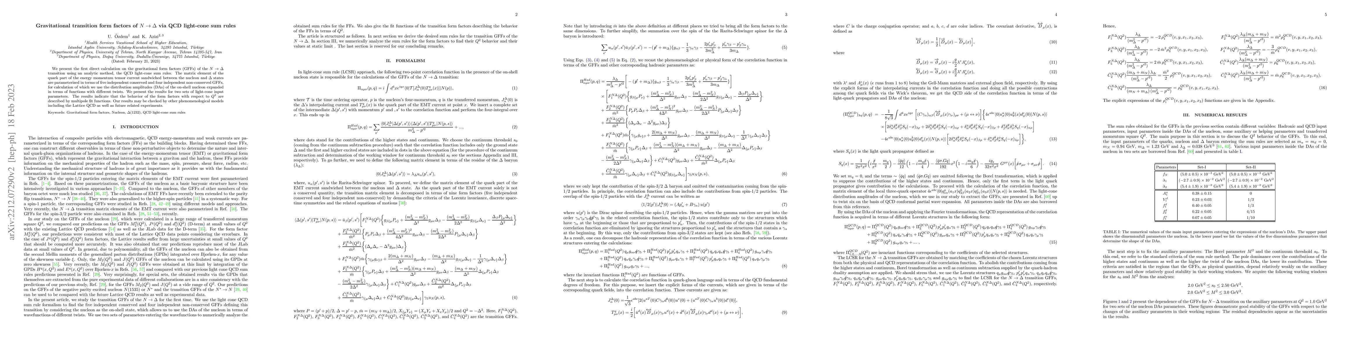 This paper calculates the first direct gravitational form factors (GFFs) for the $N \rightarrow \Delta$ transition using QCD light-cone sum rules, parameterizing the matrix element using conserved and non-conserved GFFs and distribution amplitudes. The results show that the form factors' behavior with respect to $Q^2$ fits multipole functions.