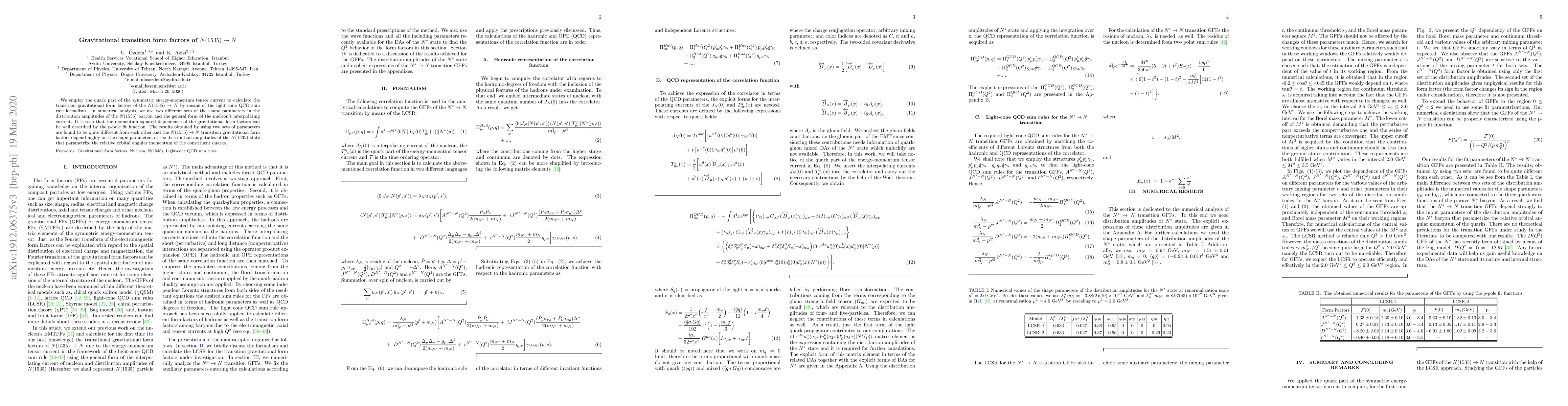 This paper calculates the transition gravitational form factors for the decay $N(1535) \rightarrow N$ using the light cone QCD sum rule formalism and different sets of shape parameters. The results vary significantly depending on the chosen parameters, highlighting the sensitivity of the form factors to the distribution amplitudes' shape.