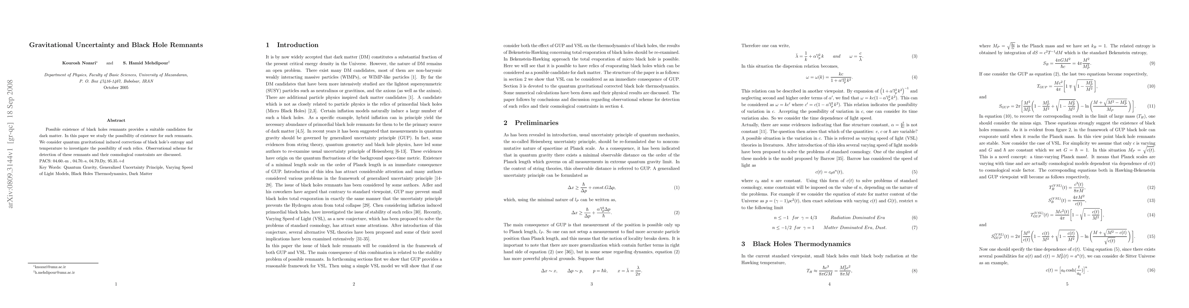 This paper explores the possibility of black hole remnants as a candidate for dark matter, investigating their quantum gravitational corrections to entropy and temperature. It discusses observational schemes for detection and cosmological constraints on such relics.