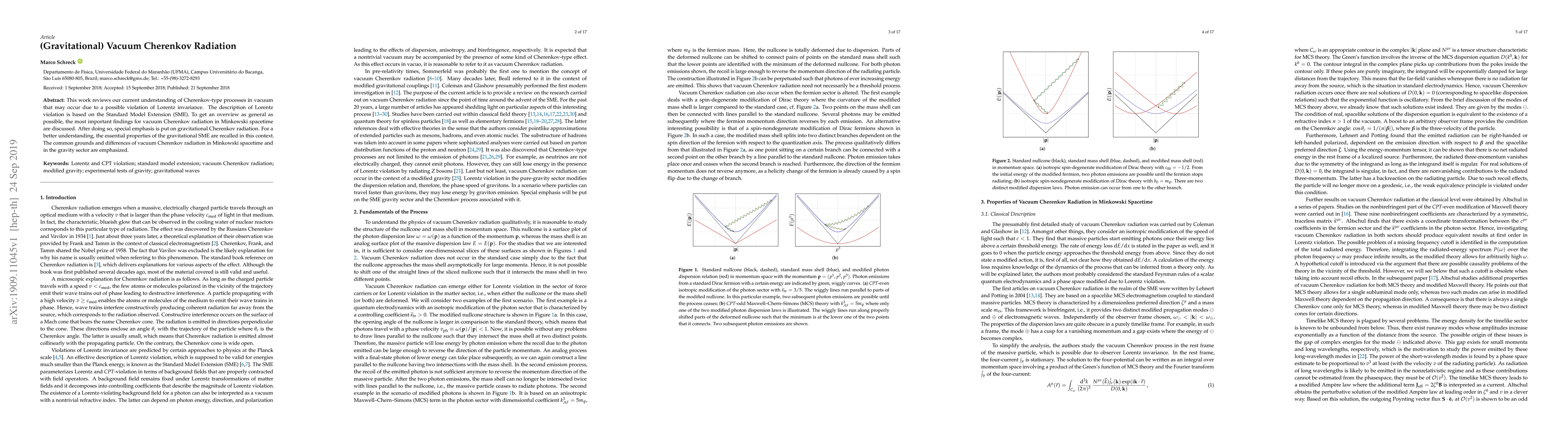 The paper presents a detailed review of vacuum Cherenkov radiation, including both Minkowski spacetime and gravitational sectors, using the Standard Model Extension framework.
