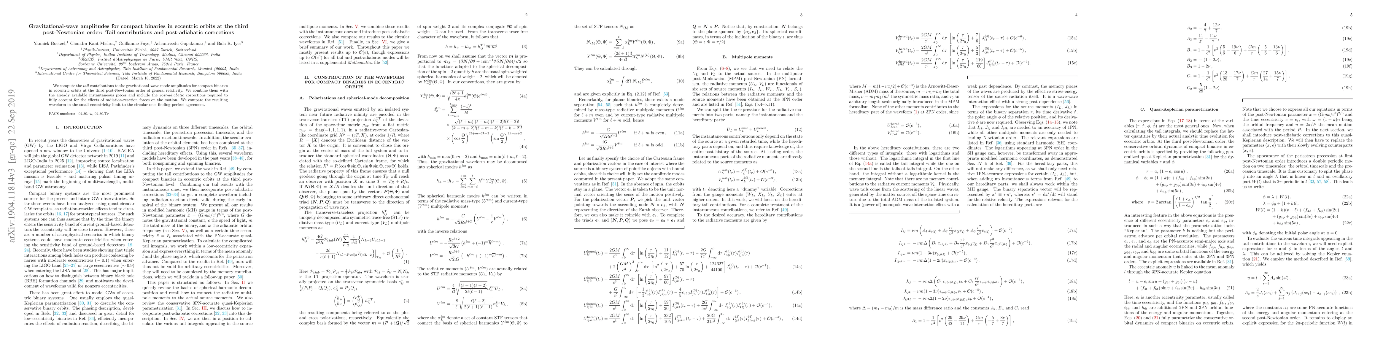 This paper calculates gravitational-wave amplitudes for eccentric compact binary systems at the third post-Newtonian order, incorporating tail contributions and post-adiabatic corrections to account for radiation-reaction forces, showing agreement with circular orbit waveforms in the small eccentricity limit.