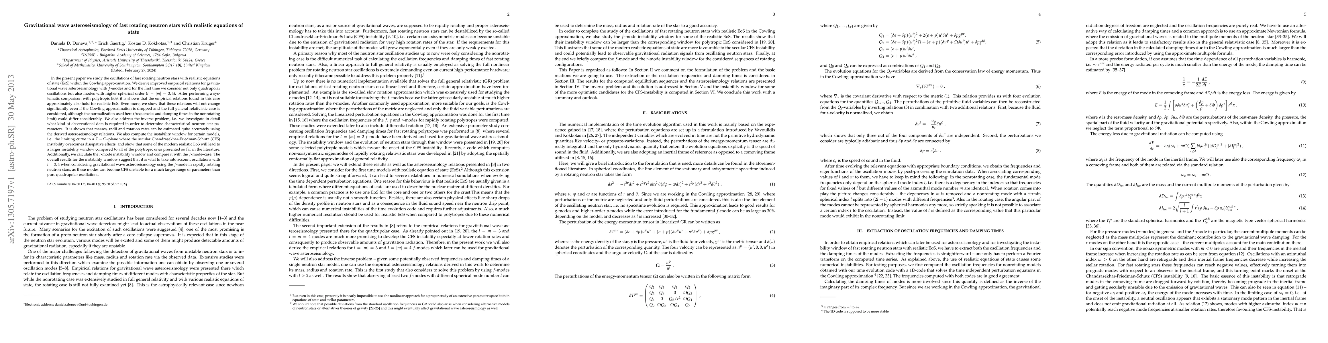 In the present paper we study the oscillations of fast rotating neutron stars with realistic equations of state (EoS) within the Cowling approximation. We derive improved empirical relations for gravitational wave asteroseismology with f-modes and for the first time we consider not only quadrupolar oscillations but also modes with higher spherical order (l=|m|=3,4). After performing a systematic comparison with polytropic EoS, it is shown that the empirical relations found in this case approximately also hold for realistic EoS. Even more, we show that these relations will not change significantly even if the Cowling approximation is dropped and the full general relativistic case is considered, although the normalization used here(frequencies and damping times in the nonrotating limit) could differ considerably. We also address the inverse problem, i.e. we investigate in detail what kind of observational data is required in order to determine characteristical neutron star parameters. It is shown that masses, radii and rotation rates can be estimated quite accurately using the derived asteroseismology relations. We also compute the instability window for certain models, i.e. the limiting curve in a T-\Omega-plane where the secular Chandrasekhar-Friedman-Schutz(CFS) instability overcomes dissipative effects, and show that some of the modern realistic EoS will lead to a larger instability window compared to all of the polytropic ones presented so far in the literature. Additionally, we calculate the r-mode instability window and compare it with the f-mode-case. The overall results for the instability window suggest that it is vital to take into account oscillations with l=3,4 when considering gravitational wave asteroseismology using the f-mode in rapidly rotating neutron stars, as these modes can become CFS unstable for a much larger range of parameters than pure quadrupolar oscillations.