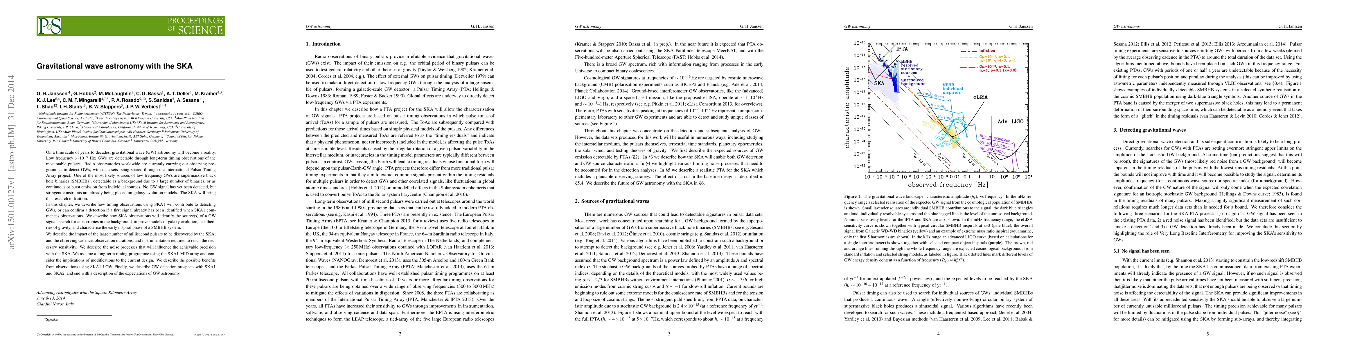 This paper discusses the potential of the Square Kilometre Array (SKA) to advance gravitational wave (GW) astronomy through the detection of low-frequency GWs via precise timing observations of stable pulsars. It outlines how SKA1 will contribute to identifying GW sources, testing gravity theories, and improving galaxy evolution models, emphasizing the significance of the large number of millisecond pulsars to be discovered.