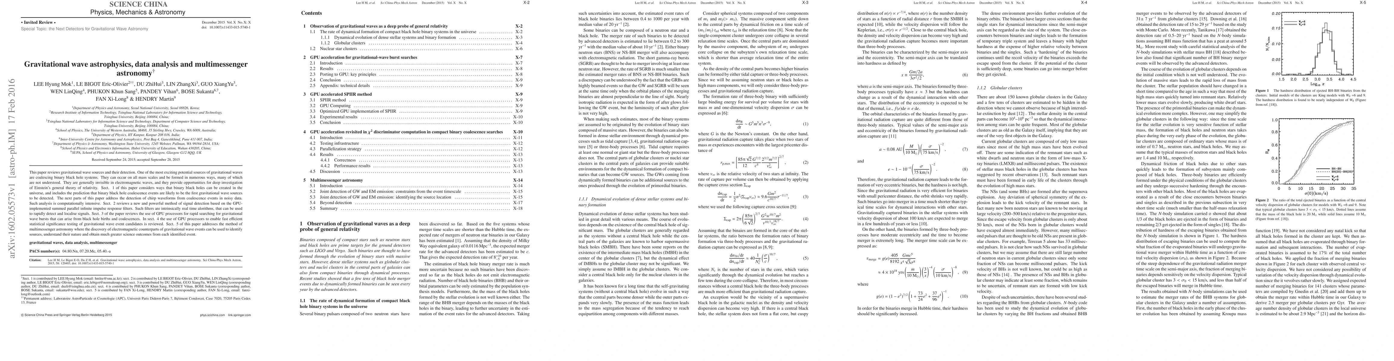 This paper reviews gravitational wave sources, particularly coalescing binary black holes, and their detection methods. It discusses the creation of binary black holes and predicts their detection as the first gravitational wave sources, followed by advanced data analysis techniques using GPU-implemented filters for signal detection and rapid localization.