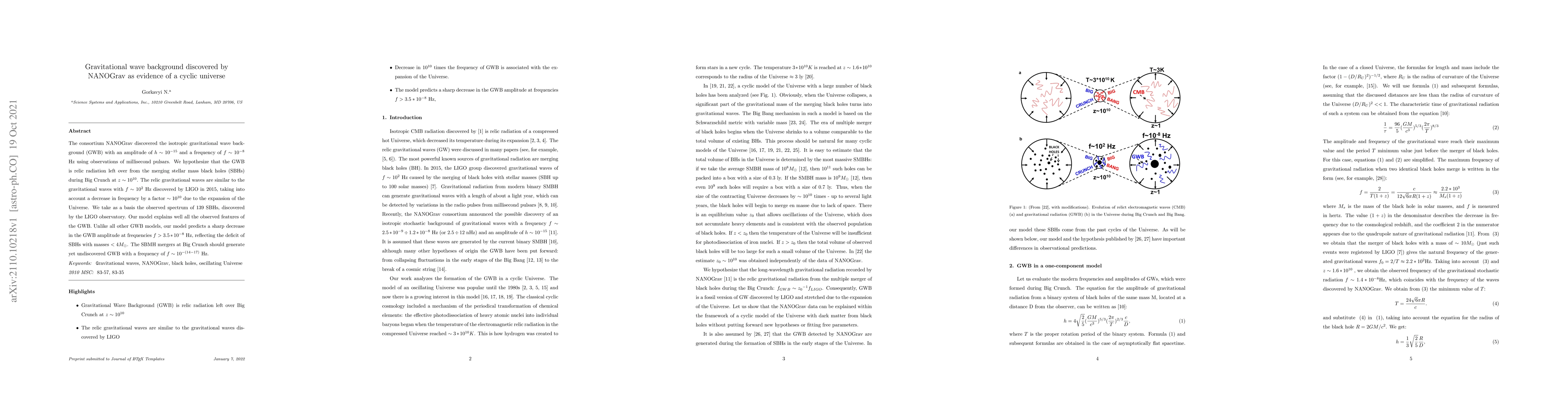 The consortium NANOGrav discovered the isotropic gravitational wave background (GWB) with an amplitude of $h\sim 10^{-15}$ and a frequency of $f\sim 10^{-8}$ Hz using observations of millisecond pulsars. We hypothesize that the GWB is relic radiation left over from the merging stellar mass black holes (SBHs) during Big Crunch at $z\sim 10^{10}$. The relic gravitational waves are similar to the gravitational waves with $f\sim 10^2$ Hz discovered by LIGO in 2015, taking into account a decrease in frequency by a factor $\sim 10^{10}$ due to the expansion of the Universe. We take as a basis the observed spectrum of 139 SBHs, discovered by the LIGO observatory. Our model explains well all the observed features of the GWB. Unlike all other GWB models, our model predicts a sharp decrease in the GWB amplitude at frequencies $f>3.5*10^{-8}$ Hz, reflecting the deficit of SBHs with masses $<4M_\odot$. The SBMH mergers at Big Crunch should generate yet undiscovered GWB with a frequency of $f\sim 10^{-(14-17)}$ Hz.