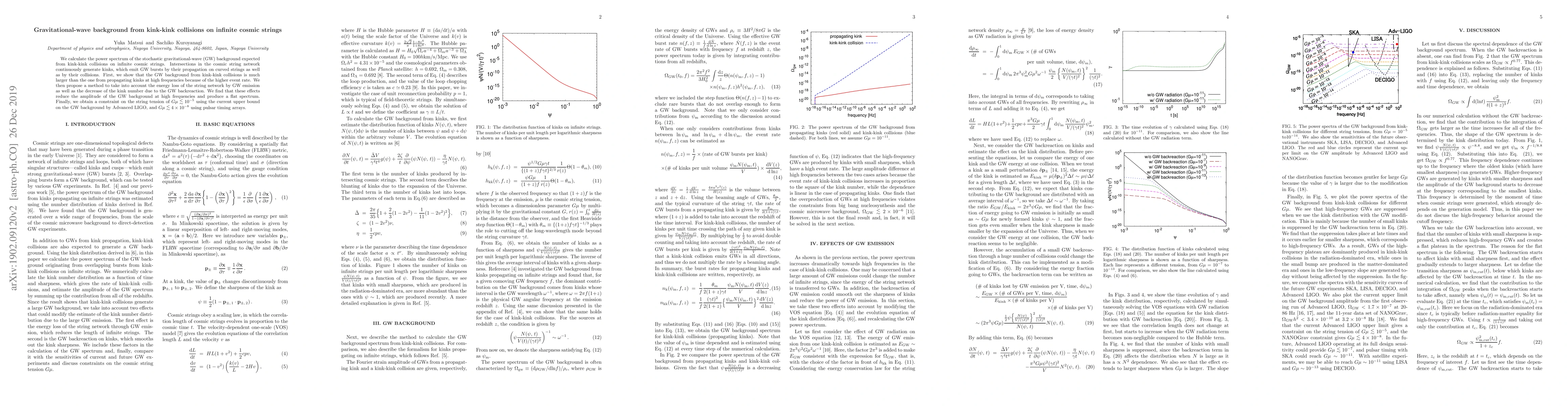 This research calculates the power spectrum of gravitational waves from kink-kink collisions on infinite cosmic strings, showing that these collisions produce a significantly larger background at high frequencies than propagating kinks. The study also accounts for energy loss and kink reduction, leading to a constraint on cosmic string tension, $G\mu\lesssim 2 \times 10^{-7}$, comparable to that from cusps on string loops.
