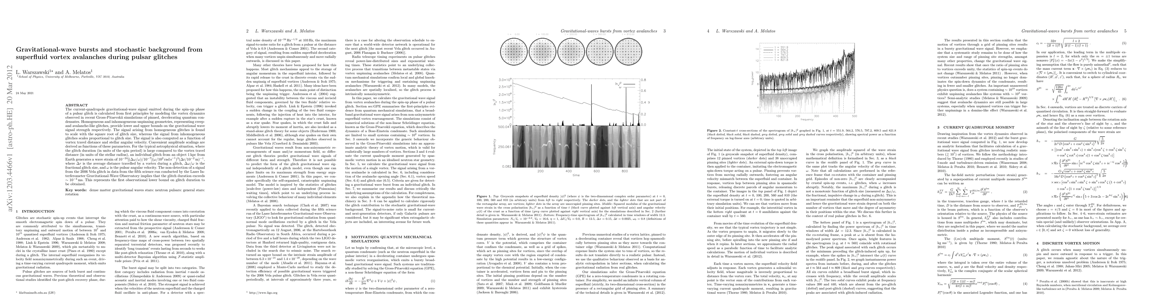 This paper calculates gravitational-wave signals from pulsar glitches due to superfluid vortex avalanches, finding that inhomogeneous glitches produce stronger signals than homogeneous ones. The derived wave strain formula provides a quantitative measure for future detections, and the non-detection of the 2006 Vela glitch sets a lower bound on glitch duration.