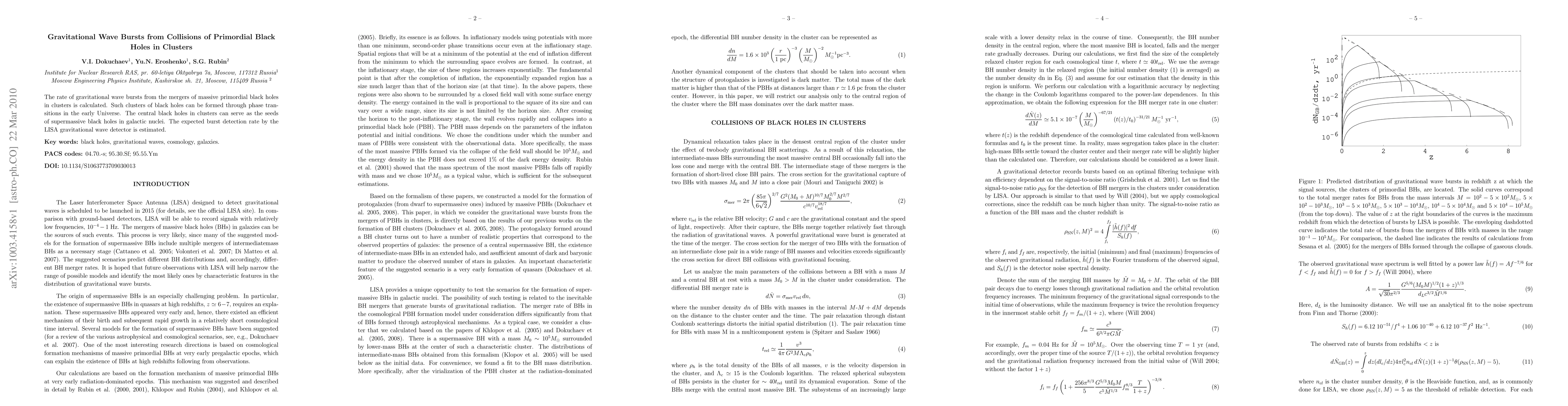 The rate of gravitational wave bursts from the mergers of massive primordial black holes in clusters is calculated. Such clusters of black holes can be formed through phase transitions in the early Universe. The central black holes in clusters can serve as the seeds of supermassive black holes in galactic nuclei. The expected burst detection rate by the LISA gravitational wave detector is estimated.