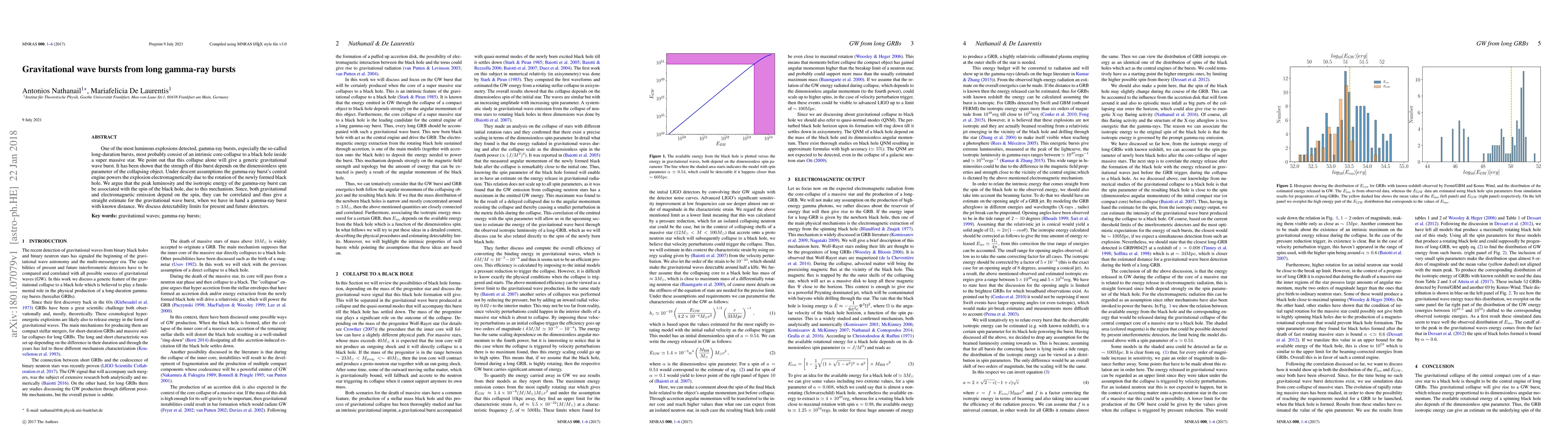 This paper explores the gravitational wave bursts generated during the core-collapse of massive stars leading to long gamma-ray bursts, suggesting a correlation between the burst's luminosity and the spin of the resulting black hole. The study discusses the detectability of these bursts by current and future gravitational wave detectors.