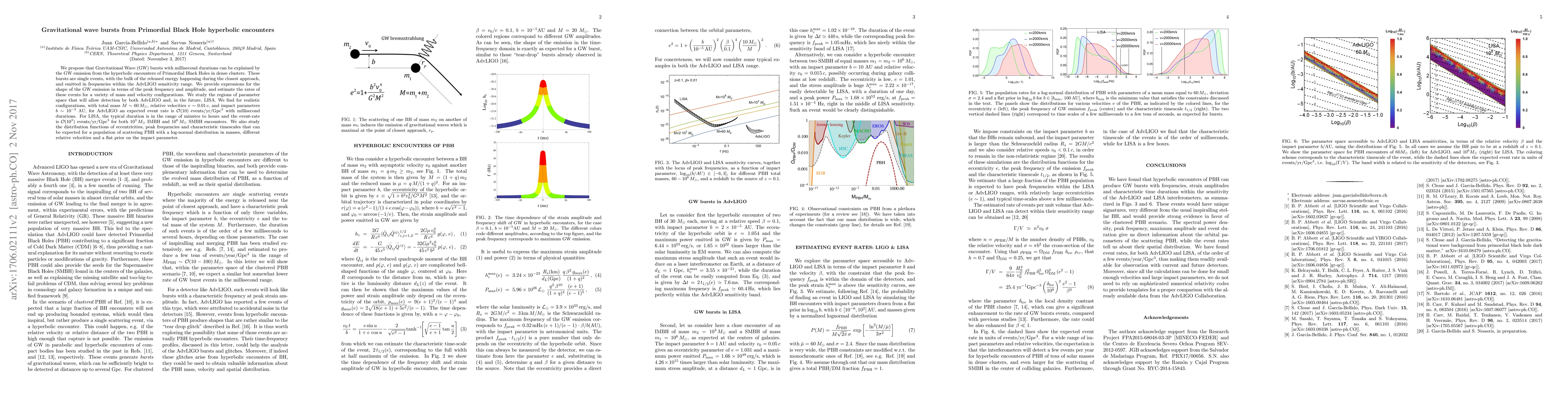This paper proposes that gravitational wave bursts with millisecond durations can be attributed to hyperbolic encounters of Primordial Black Holes in dense clusters. It estimates event rates for these encounters detectable by AdvLIGO and future LISA, finding ${\cal O}(10)$ events/yr/Gpc$^3$ for AdvLIGO and ${\cal O}(10^3)$ events/yr/Gpc$^3$ for LISA.