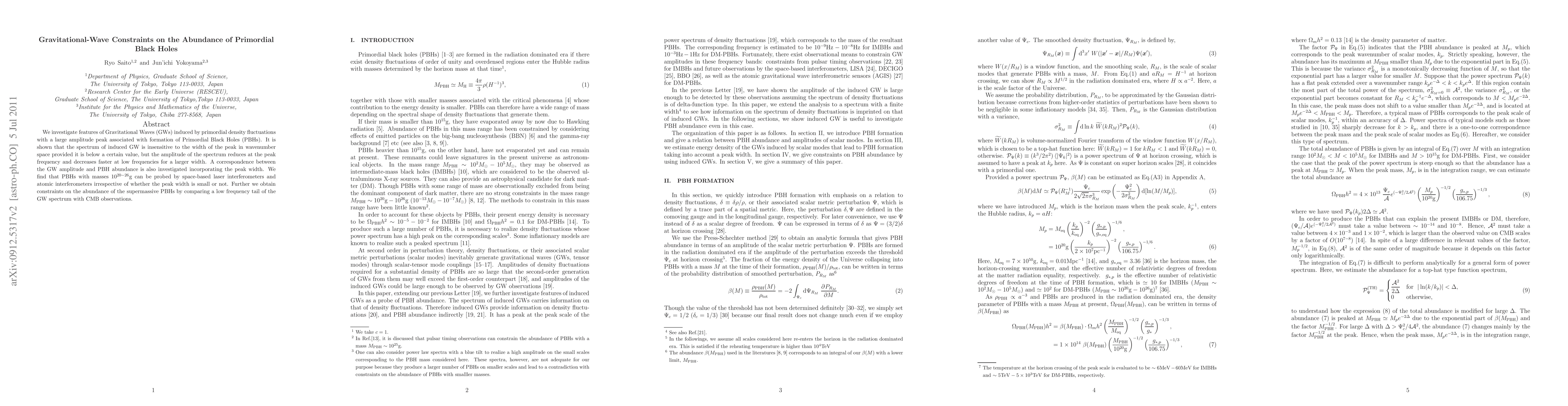 We investigate features of Gravitational Waves (GWs) induced by primordial density fluctuations with a large amplitude peak associated with formation of Primordial Black Holes (PBHs). It is shown that the spectrum of induced GW is insensitive to the width of the peak in wavenumber space provided it is below a certain value, but the amplitude of the spectrum reduces at the peak frequency and decreases faster at low frequencies for a larger width. A correspondence between the GW amplitude and PBH abundance is also investigated incorporating the peak width. We find that PBHs with masses 10^{20-26}g can be probed by space-based laser interferometers and atomic interferometers irrespective of whether the peak width is small or not. Further we obtain constraints on the abundance of the supermassive PBHs by comparing a low frequency tail of the GW spectrum with CMB observations.
