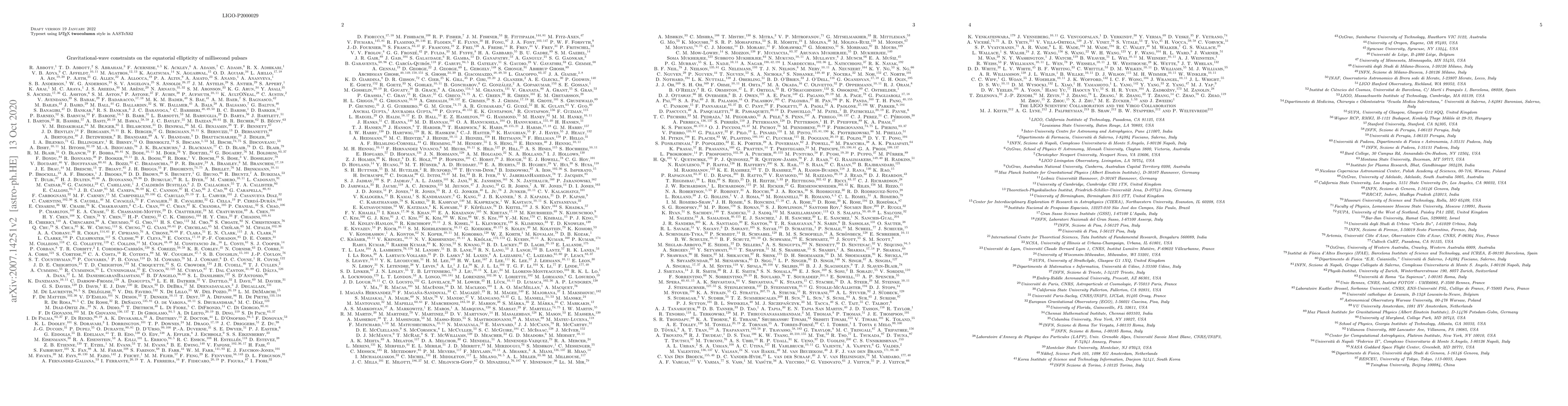 This paper reports on a search for continuous gravitational waves from five millisecond pulsars, using data from Advanced LIGO and Virgo. It constrains the equatorial ellipticities of these pulsars to be less than $10^{-8}$, improving upon previous indirect limits based on spin-down observations.