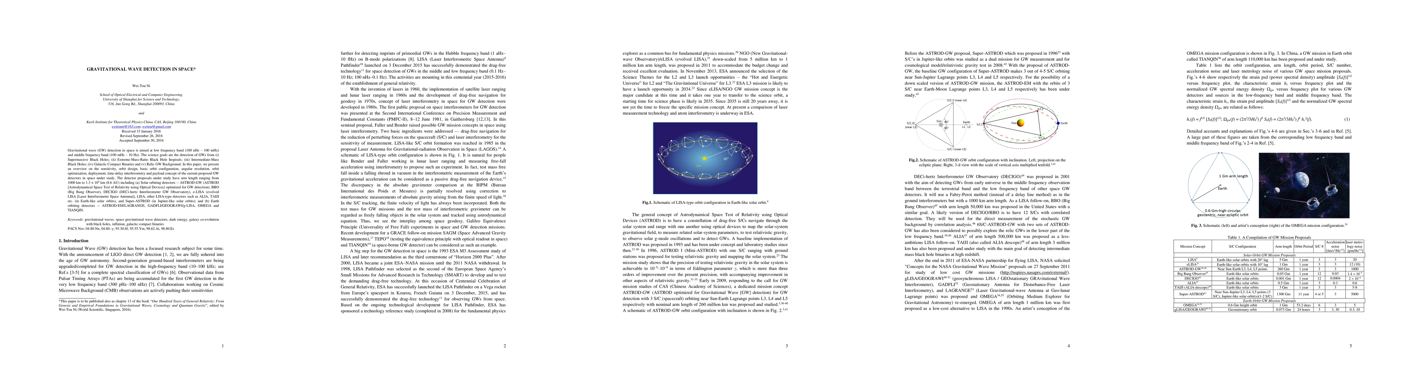 Gravitational wave (GW) detection in space is aimed at low frequency band (100 nHz - 100 mHz) and middle frequency band (100 mHz - 10 Hz). The science goals are the detection of GWs from (i) Supermassive Black Holes; (ii) Extreme-Mass-Ratio Black Hole Inspirals; (iii) Intermediate-Mass Black Holes; (iv) Galactic Compact Binaries and (v) Relic GW Background. In this paper, we present an overview on the sensitivity, orbit design, basic orbit configuration, angular resolution, orbit optimization, deployment, time-delay interferometry and payload concept of the current proposed GW detectors in space under study. The detector proposals under study have arm length ranging from 1000 km to 1.3 x 109 km (8.6 AU) including (a) Solar orbiting detectors -- ASTROD-GW (ASTROD [Astrodynamical Space Test of Relativity using Optical Devices] optimized for GW detection), BBO (Big Bang Observer), DECIGO (DECi-hertz Interferometer GW Observatory), e-LISA (evolved LISA [Laser Interferometer Space Antenna]), LISA, other LISA-type detectors such as ALIA, TAIJI etc. (in Earth-like solar orbits), and Super-ASTROD (in Jupiter-like solar orbits); and (b) Earth orbiting detectors -- ASTROD-EM/LAGRANGE, GADFLI/GEOGRAWI/g-LISA, OMEGA and TIANQIN.