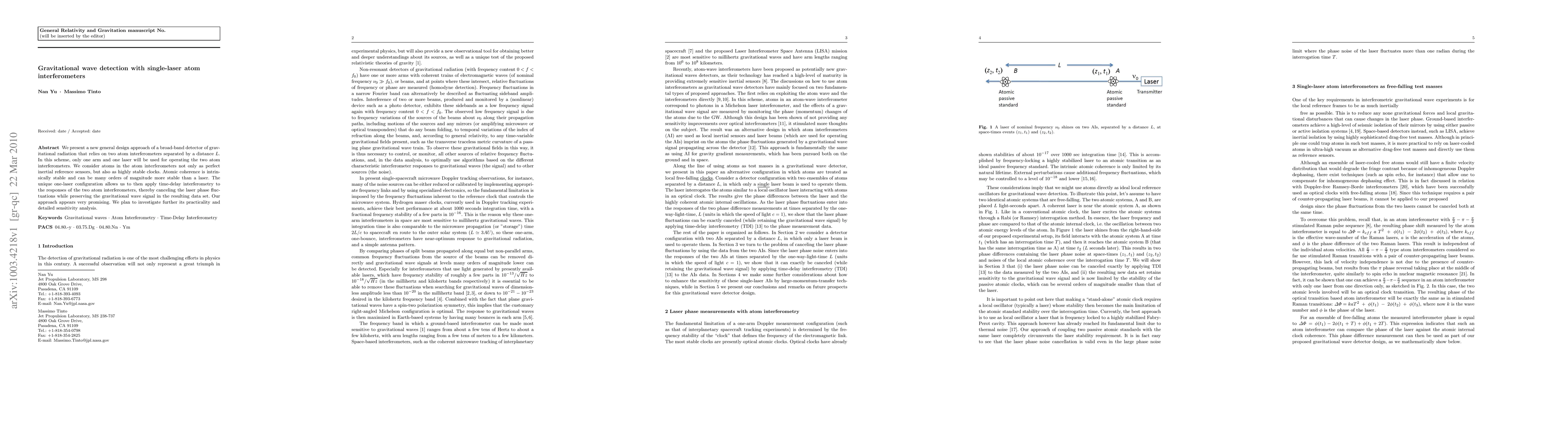 This research proposes a novel design for a broad-band gravitational wave detector using two atom interferometers, each operating with a single laser. The atoms serve as both inertial reference sensors and highly stable clocks, leveraging atomic coherence to cancel laser phase fluctuations and maintain gravitational wave signals. The feasibility and sensitivity of this one-laser configuration are set for further investigation.