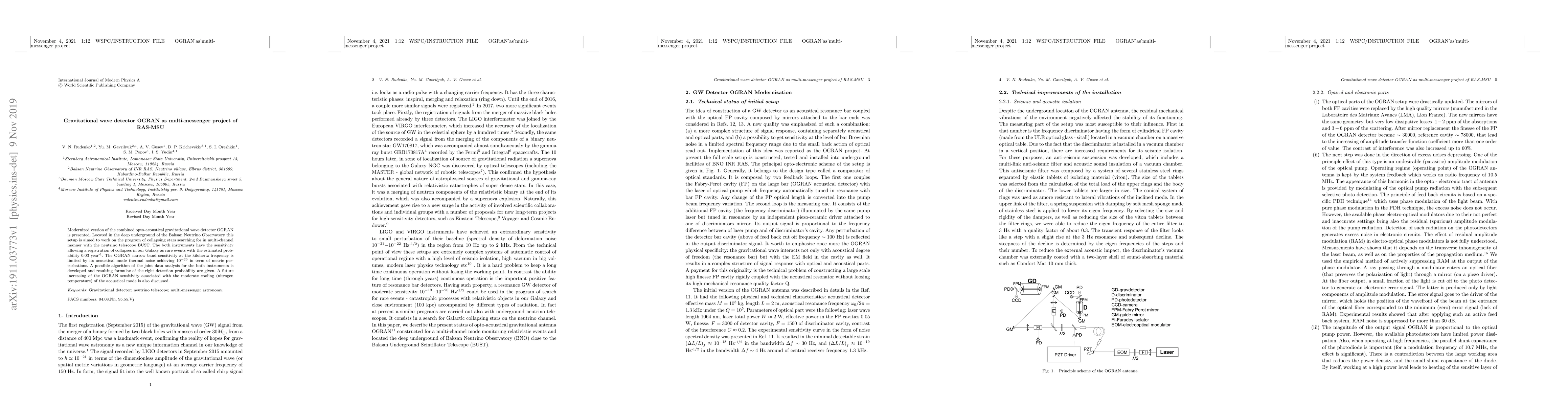 Modernized version of the combined opto-acoustical gravitational wave detector OGRAN is presented. Located in the deep underground of the Baksan Neutrino Observatory this setup is aimed to work on the program of collapsing stars searching for in multi-channel manner with the neutrino telescope BUST. The both instruments have the sensitivity allowing a registration of collapses in our Galaxy as rare events with the estimated probability 0:03 year-1. The OGRAN narrow band sensitivity at the kilohertz frequency is limited by its acoustical mode thermal noise achieving 10^{-20} in term of metric perturbations. A possible algorithm of the joint data analysis for the both instruments is developed and resulting formulae of the right detection probability are given. A future increasing of the OGRAN sensitivity associated with the moderate cooling (nitrogen temperature) of the acoustical mode is also discussed.