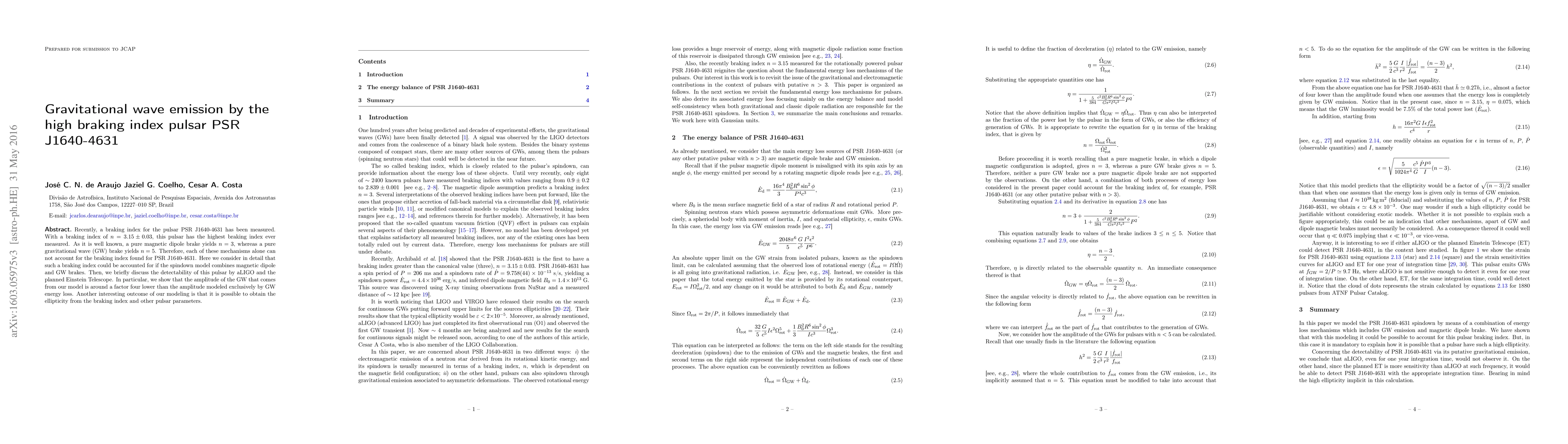 Recently, a braking index for the pulsar PSR J1640-4631 has been measured. With a braking index of $n = 3.15 \pm 0.03$, this pulsar has the highest braking index ever measured. As it is well known, a pure magnetic dipole brake yields $n = 3$, whereas a pure gravitational wave brake yields $n = 5$. Therefore, each of these mechanisms alone can not account for the braking index found for PSR J1640-4631. Here we show that such a braking index can be accounted for if the spindown model combines magnetic dipole and gravitational wave brakes. Then, we briefly discuss the detectability of this pulsar by aLIGO and the planned Einstein Telescope. In particular, we show that the amplitude of the gravitational wave that comes from our model is around a factor four lower than the amplitude modeled exclusively by gravitational wave energy loss. Another interesting outcome of our modeling is that we are able to obtain the ellipticity from the braking index and other pulsar parameters.