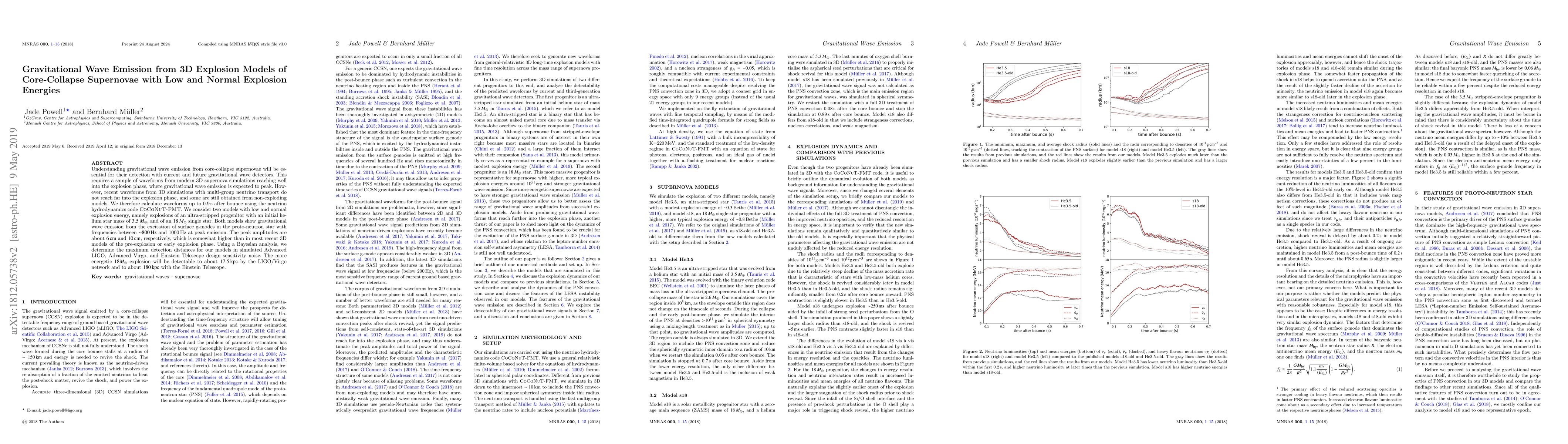This paper investigates gravitational wave emission from 3D explosion models of core-collapse supernovae with low and normal explosion energies, finding peak frequencies between 800 Hz and 1000 Hz and peak amplitudes of 6 cm and 10 cm. The more energetic model of an 18 M☉ star is detectable up to 180 kpc with the Einstein Telescope.