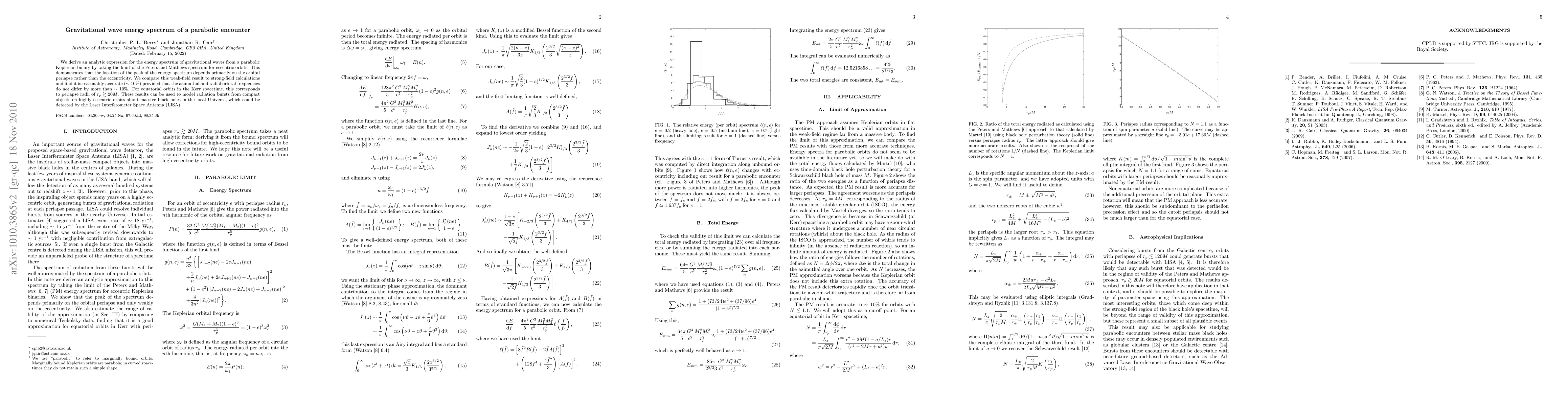 We derive an analytic expression for the energy spectrum of gravitational waves from a parabolic Keplerian binary by taking the limit of the Peters and Matthews spectrum for eccentric orbits. This demonstrates that the location of the peak of the energy spectrum depends primarily on the orbital periapse rather than the eccentricity. We compare this weak-field result to strong-field calculations and find it is reasonably accurate (~10%) provided that the azimuthal and radial orbital frequencies do not differ by more than ~10%. For equatorial orbits in the Kerr spacetime, this corresponds to periapse radii of rp > 20M. These results can be used to model radiation bursts from compact objects on highly eccentric orbits about massive black holes in the local Universe, which could be detected by LISA.