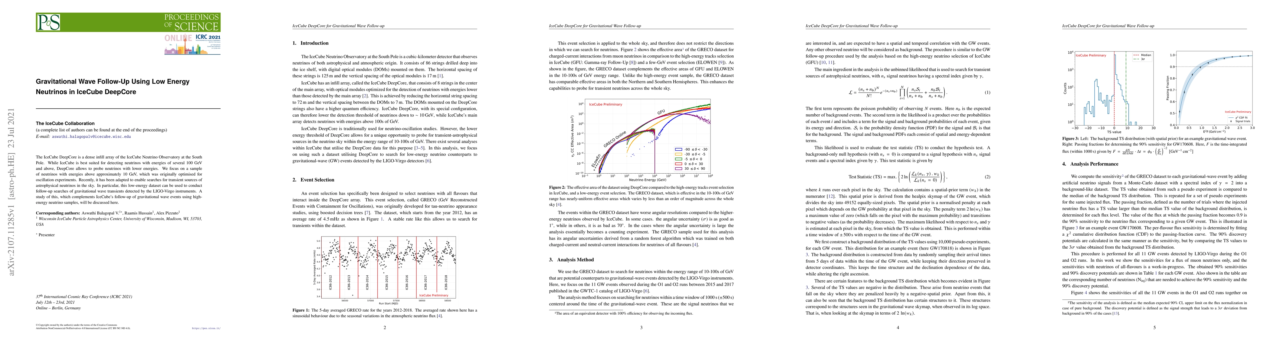 The IceCube DeepCore is a dense infill array of the IceCube Neutrino Observatory at the South Pole. While IceCube is best suited for detecting neutrinos with energies of several 100 GeV and above, DeepCore allows to probe neutrinos with lower energies. We focus on a sample of neutrinos with energies above approximately 10 GeV, which was originally optimised for oscillation experiments. Recently, it has been adapted to enable searches for transient sources of astrophysical neutrinos in the sky. In particular, this low-energy dataset can be used to conduct follow-up searches of gravitational wave transients detected by the LIGO-Virgo instruments. A study of this, which complements IceCube's follow-up of gravitational wave events using high-energy neutrino samples, will be discussed here.