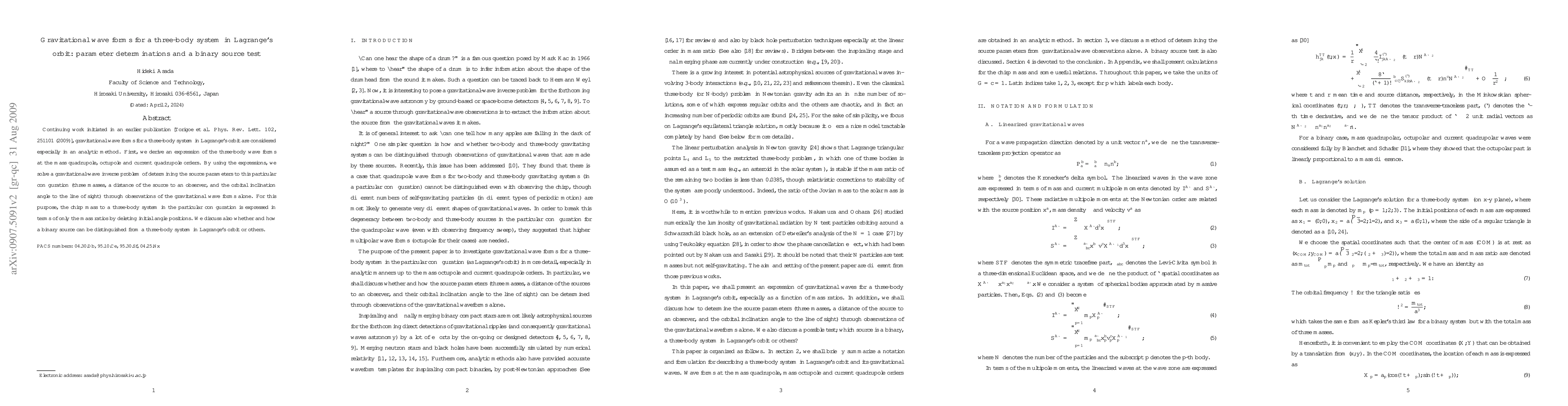 Continuing work initiated in an earlier publication [Torigoe et al. Phys. Rev. Lett. {\bf 102}, 251101 (2009)], gravitational wave forms for a three-body system in Lagrange's orbit are considered especially in an analytic method. First, we derive an expression of the three-body wave forms at the mass quadrupole, octupole and current quadrupole orders. By using the expressions, we solve a gravitational-wave {\it inverse} problem of determining the source parameters to this particular configuration (three masses, a distance of the source to an observer, and the orbital inclination angle to the line of sight) through observations of the gravitational wave forms alone. For this purpose, the chirp mass to a three-body system in the particular configuration is expressed in terms of only the mass ratios by deleting initial angle positions. We discuss also whether and how a binary source can be distinguished from a three-body system in Lagrange's orbit or others.