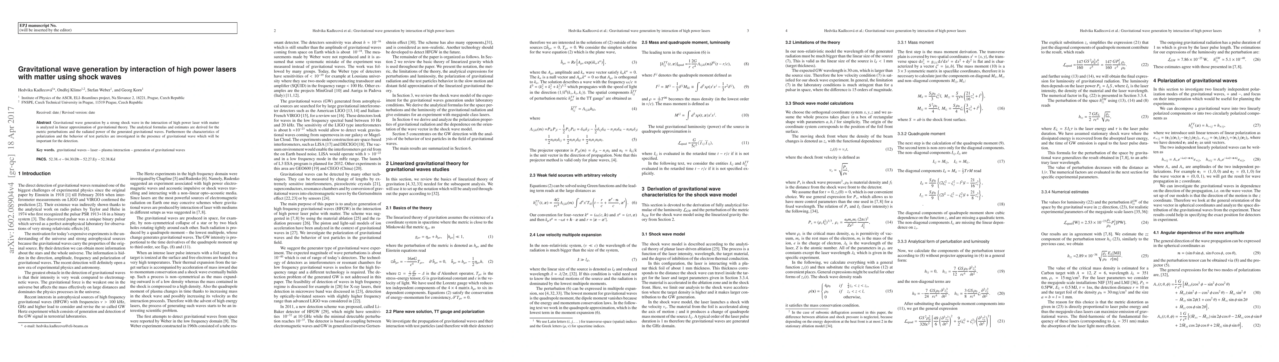 This research analyzes gravitational wave generation from high power laser interactions with matter, focusing on shock waves. Analytical formulas are derived for metric perturbations and radiated gravitational wave power, while also examining polarization characteristics and test particle behavior for detection purposes.