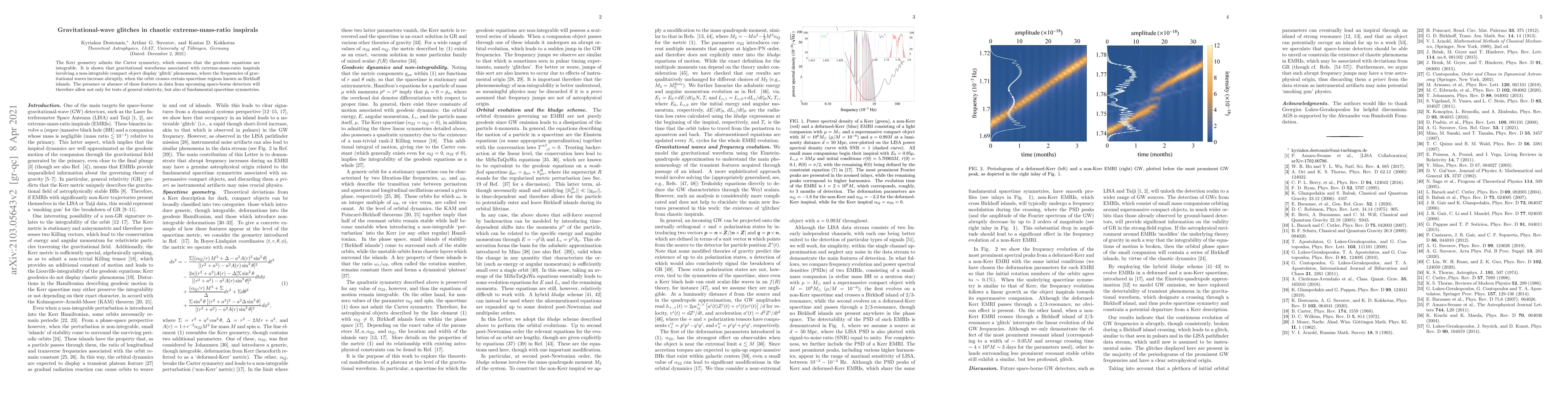 The Kerr geometry admits the Carter symmetry, which ensures that the geodesic equations are integrable. It is shown that gravitational waveforms associated with extreme-mass-ratio inspirals involving a non-integrable compact object display `glitch' phenomena, where the frequencies of gravitational waves increase abruptly, when the orbit crosses certain spacetime regions known as Birkhoff islands. The presence or absence of these features in data from upcoming space-borne detectors will therefore allow not only for tests of general relativity, but also of fundamental spacetime symmetries.