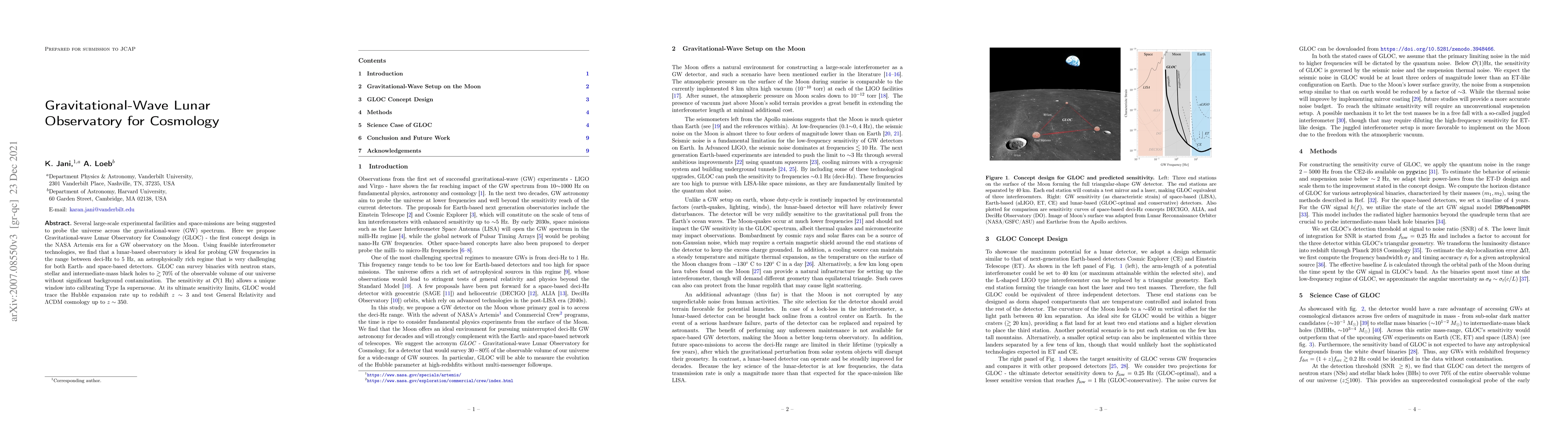 The proposed Gravitational-Wave Lunar Observatory for Cosmology (GLOC) aims to utilize lunar-based interferometers to detect gravitational waves in the deci-Hz to 5 Hz range, offering unprecedented sensitivity and coverage over the universe. GLOC is poised to survey neutron star and black hole binaries, calibrate Type Ia supernovae, and test cosmological models up to high redshifts.