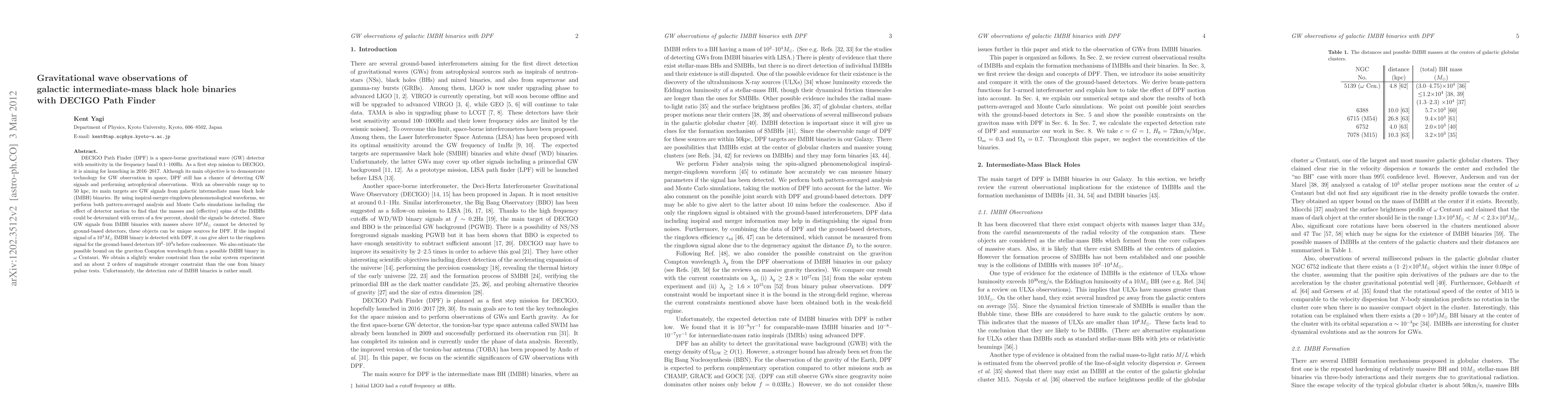 DECIGO Path Finder (DPF) is a space-borne gravitational wave (GW) detector with sensitivity in the frequency band 0.1--100Hz. As a first step mission to DECIGO, it is aiming for launching in 2016--2017. Although its main objective is to demonstrate technology for GW observation in space, DPF still has a chance of detecting GW signals and performing astrophysical observations. With an observable range up to 50 kpc, its main targets are GW signals from galactic intermediate mass black hole (IMBH) binaries. By using inspiral-merger-ringdown phenomenological waveforms, we perform both pattern-averaged analysis and Monte Carlo simulations including the effect of detector motion to find that the masses and (effective) spins of the IMBHs could be determined with errors of a few percent, should the signals be detected. Since GW signals from IMBH binaries with masses above $10^4 M_\odot$ cannot be detected by ground-based detectors, these objects can be unique sources for DPF. If the inspiral signal of a $10^3M_\odot$ IMBH binary is detected with DPF, it can give alert to the ringdown signal for the ground-based detectors $10^2$--$10^3$s before coalescence. We also estimate the possible bound on the graviton Compton wavelength from a possible IMBH binary in $\omega$ Centauri. We obtain a slightly weaker constraint than the solar system experiment and an about 2 orders of magnitude stronger constraint than the one from binary pulsar tests. Unfortunately, the detection rate of IMBH binaries is rather small.