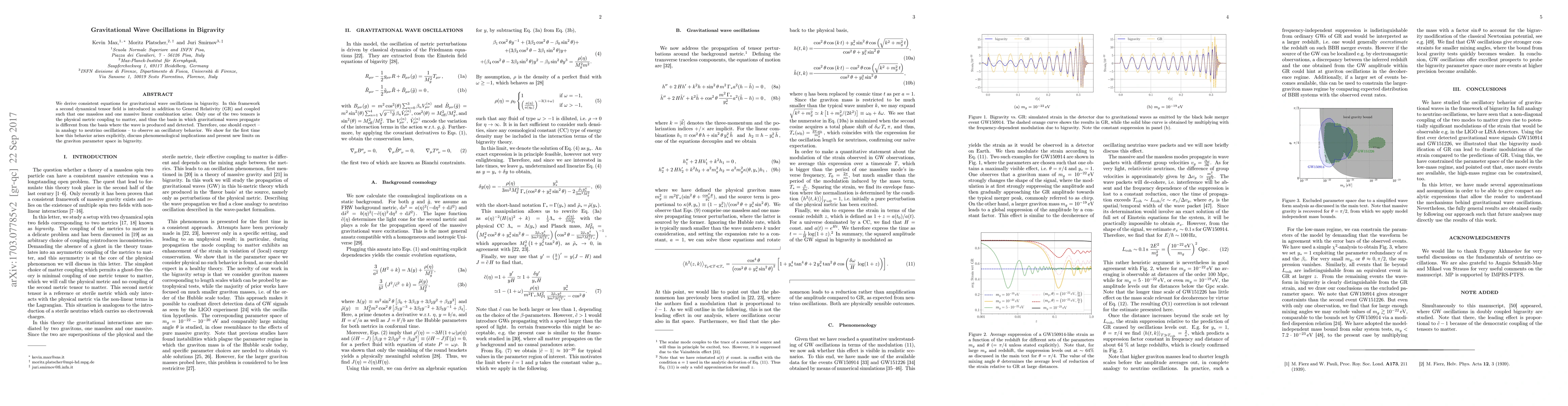 This paper derives equations for gravitational wave oscillations in bigravity, a theory introducing a second dynamical tensor field alongside General Relativity. It predicts oscillatory behavior akin to neutrino oscillations, discusses its implications, and sets new limits on the graviton parameter space.