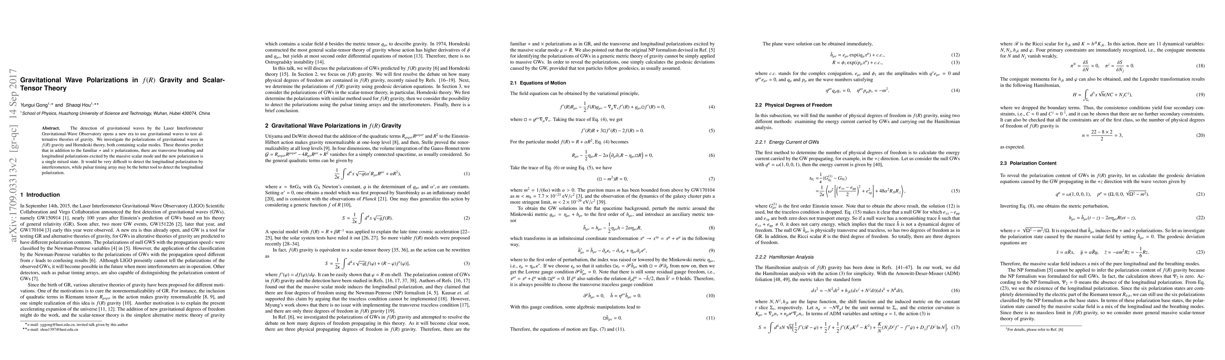 Summary: This paper explores gravitational wave polarizations in $f(R)$ gravity and Horndeski theory, revealing additional scalar-mode polarizations beyond the standard $+$ and $\times$ types. While interferometers may struggle to detect the longitudinal polarization, pulsar timing arrays show potential for such detections.
