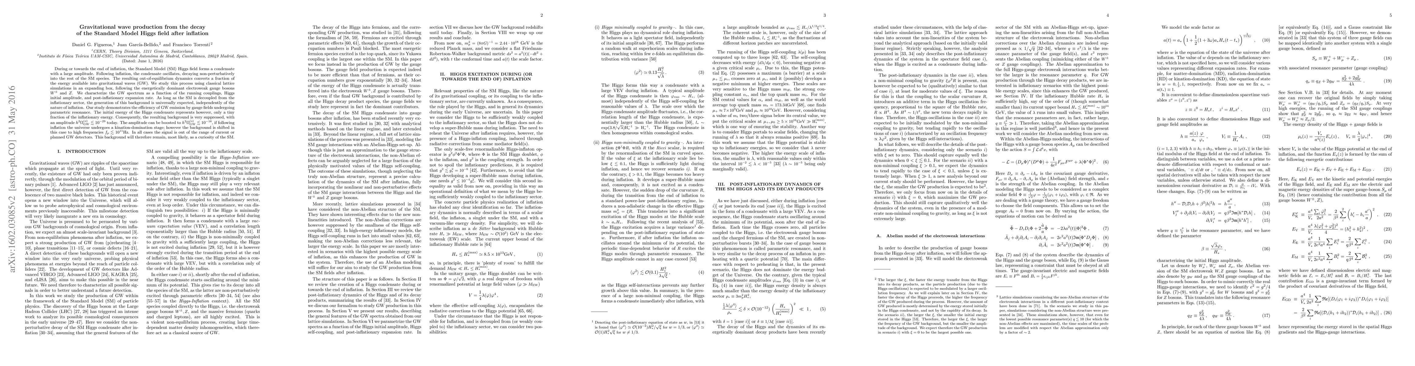 This research paper studies how the Standard Model Higgs field decays after inflation, producing gravitational waves, which are too weak to be detected by current or planned detectors.