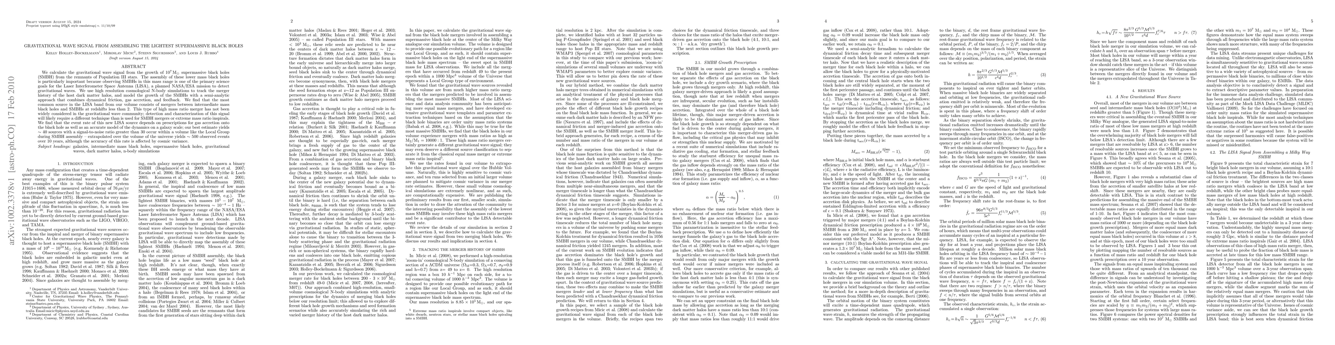We calculate the gravitational wave signal from the growth of 10 million solar mass supermassive black holes (SMBH) from the remnants of Population III stars. The assembly of these lower mass black holes is particularly important because observing SMBHs in this mass range is one of the primary science goals for the Laser Interferometer Space Antenna (LISA), a planned NASA/ESA mission to detect gravitational waves. We use high resolution cosmological N-body simulations to track the merger history of the host dark matter halos, and model the growth of the SMBHs with a semi-analytic approach that combines dynamical friction, gas accretion, and feedback. We find that the most common source in the LISA band from our volume consists of mergers between intermediate mass black holes and SMBHs at redshifts less than 2. This type of high mass ratio merger has not been widely considered in the gravitational wave community; detection and characterization of this signal will likely require a different technique than is used for SMBH mergers or extreme mass ratio inspirals. We find that the event rate of this new LISA source depends on prescriptions for gas accretion onto the black hole as well as an accurate model of the dynamics on a galaxy scale; our best estimate yields about 40 sources with a signal-to-noise ratio greater than 30 occur within a volume like the Local Group during SMBH assembly -- extrapolated over the volume of the universe yields roughly 500 observed events over 10 years, although the accuracy of this rate is affected by cosmic variance.