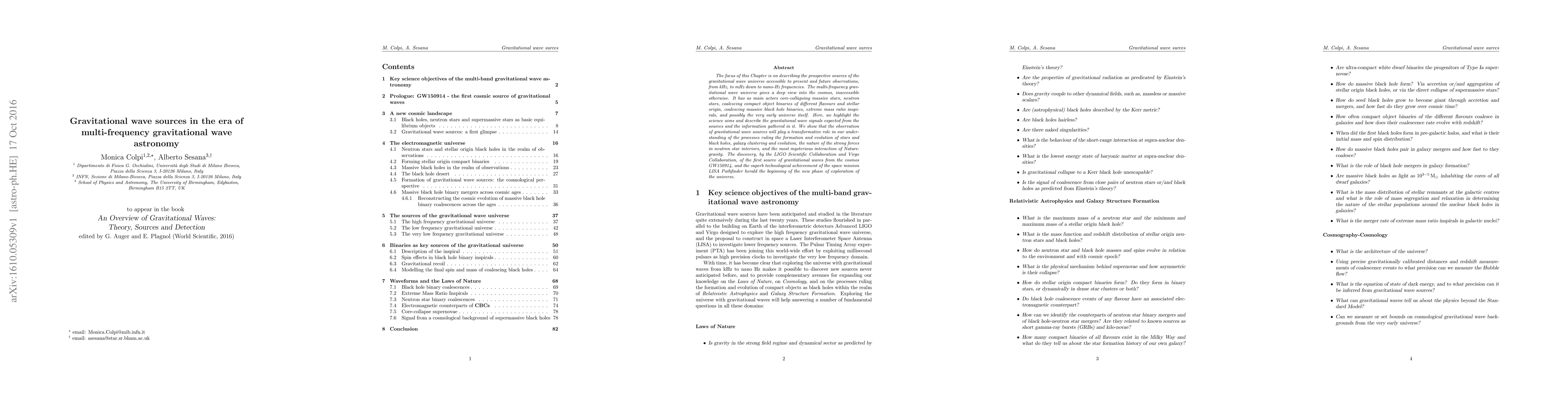 The focus of this Chapter is on describing the prospective sources of the gravitational wave universe accessible to present and future observations, from kHz, to mHz down to nano-Hz frequencies. The multi-frequency gravitational wave universe gives a deep view into the cosmos, inaccessible otherwise. It has as main actors core-collapsing massive stars, neutron stars, coalescing compact object binaries of different flavours and stellar origin, coalescing massive black hole binaries, extreme mass ratio inspirals, and possibly the very early universe itself. Here, we highlight the science aims and describe the gravitational wave signals expected from the sources and the information gathered in it. We show that the observation of gravitational wave sources will play a transformative role in our understanding of the processes ruling the formation and evolution of stars and black holes, galaxy clustering and evolution, the nature of the strong forces in neutron star interiors, and the most mysterious interaction of Nature: gravity. The discovery, by the LIGO Scientific Collaboration and Virgo Collaboration, of the first source of gravitational waves from the cosmos GW150914, and the superb technological achievement of the space mission LISA Pathfinder herald the beginning of the new phase of exploration of the universe.