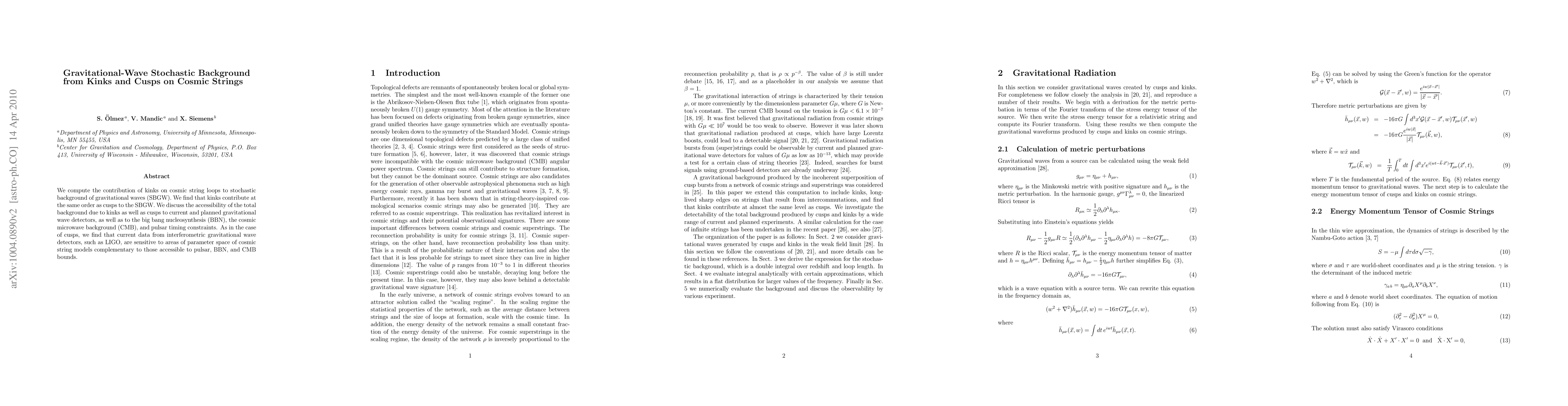 We compute the contribution of kinks on cosmic string loops to stochastic background of gravitational waves (SBGW).We find that kinks contribute at the same order as cusps to the SBGW.We discuss the accessibility of the total background due to kinks as well as cusps to current and planned gravitational wave detectors, as well as to the big bang nucleosynthesis (BBN), the cosmic microwave background (CMB), and pulsar timing constraints. As in the case of cusps, we find that current data from interferometric gravitational wave detectors, such as LIGO, are sensitive to areas of parameter space of cosmic string models complementary to those accessible to pulsar, BBN, and CMB bounds.