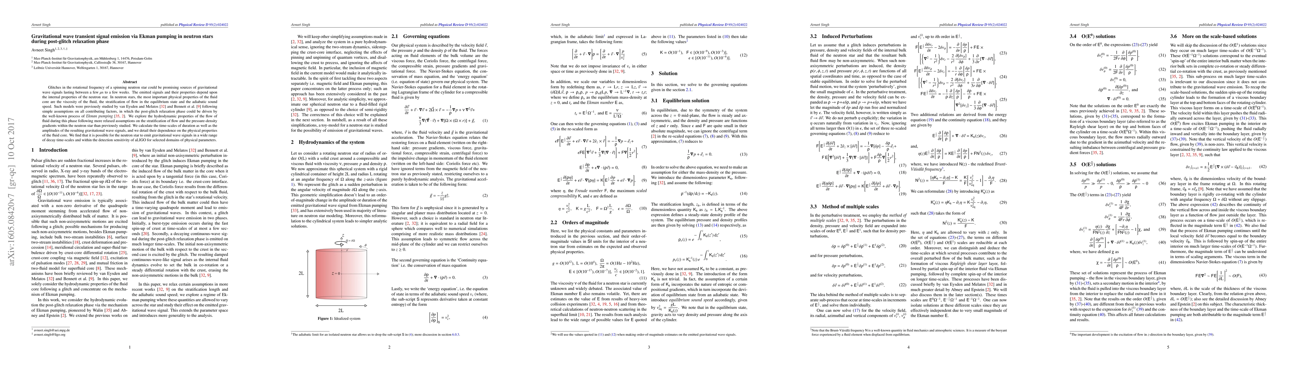 Glitches in the rotational frequency of a spinning neutron star could be promising sources of gravitational wave signals lasting between a few microseconds to a few weeks. The emitted signals and their properties depend upon the internal properties of the neutron star. In neutron stars, the most important physical properties of the fluid core are the viscosity of the fluid, the stratification of flow in the equilibrium state and the adiabatic sound speed. Such models were previously studied by van Eysden and Melatos [73] and Bennett et al. [26] following simple assumptions on all contributing factors, in which the post-glitch relaxation phase could be driven by the well-known process of Ekman pumping [76, 17]. We explore the hydrodynamic properties of the flow of fluid during this phase following more relaxed assumptions on the stratification of flow and the pressure-density gradients within the neutron star than previously studied. We calculate the time-scales of duration as well as the amplitudes of the resulting gravitational wave signals, and we detail their dependence on the physical properties of the fluid core. We find that it is possible for the neutron star to emit gravitational wave signals in a wide range of decay time-scales and within the detection sensitivity of aLIGO for selected domains of physical parameters.