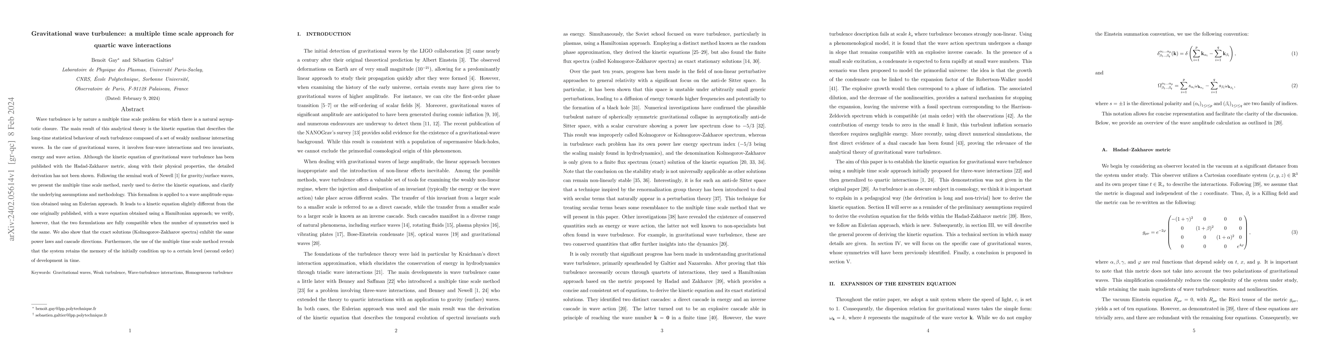 Wave turbulence is by nature a multiple time scale problem for which there is a natural asymptotic closure. The main result of this analytical theory is the kinetic equation that describes the long-time statistical behaviour of such turbulence composed of a set of weakly nonlinear interacting waves. In the case of gravitational waves, it involves four-wave interactions and two invariants, energy and wave action. Although the kinetic equation of gravitational wave turbulence has been published with the Hadad-Zakharov metric, along with their physical properties, the detailed derivation has not been shown. Following the seminal work of Newell (1968) for gravity/surface waves, we present the multiple time scale method, rarely used to derive the kinetic equations, and clarify the underlying assumptions and methodology. This formalism is applied to a wave amplitude equation obtained using an Eulerian approach. It leads to a kinetic equation slightly different from the one originally published, with a wave equation obtained using a Hamiltonian approach; we verify, however, that the two formulations are fully compatible when the number of symmetries used is the same. We also show that the exact solutions (Kolmogorov-Zakharov spectra) exhibit the same power laws and cascade directions. Furthermore, the use of the multiple time scale method reveals that the system retains the memory of the initially condition up to a certain level (second order) of development in time.