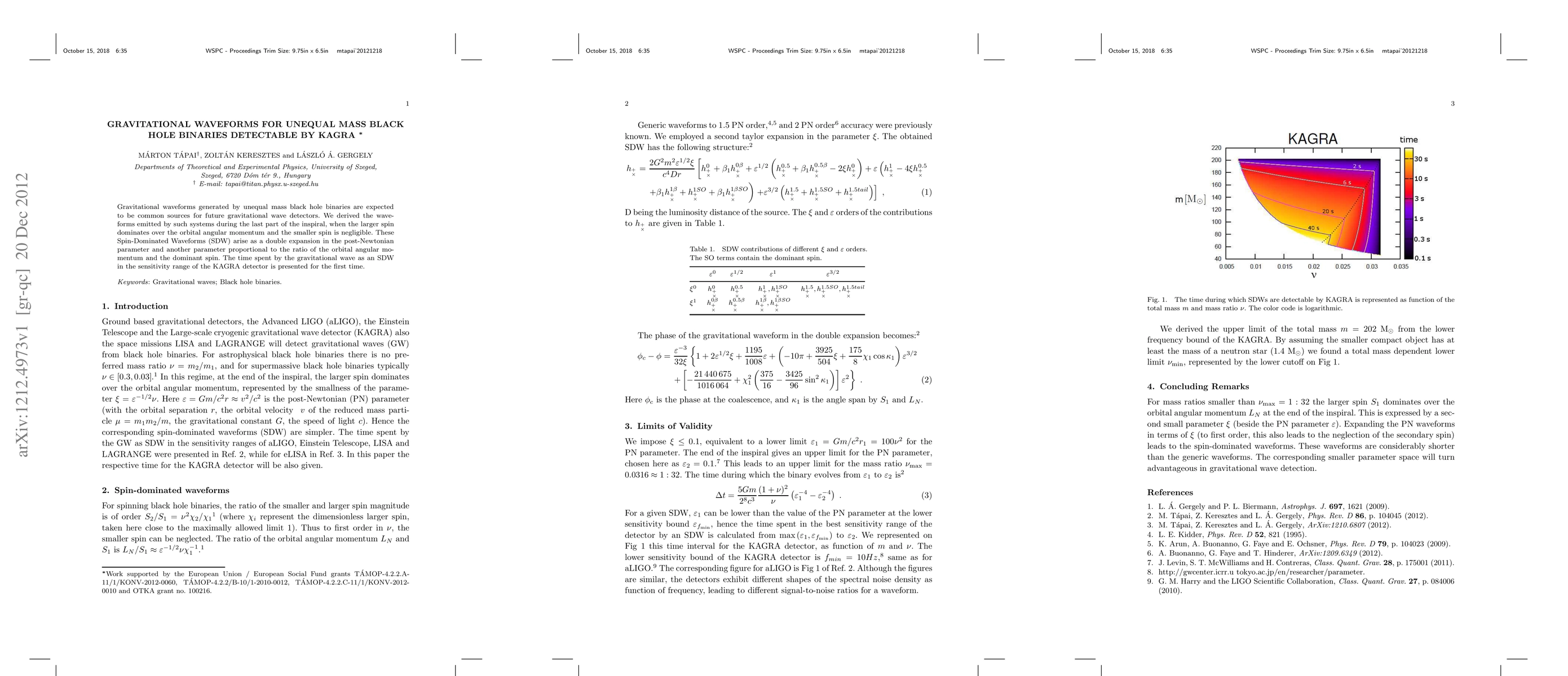 This paper derives gravitational waveforms for unequal mass black hole binaries detectable by KAGRA, focusing on the Spin-Dominated Waveform (SDW) phase. It presents the time these SDWs spend within KAGRA's sensitivity range for the first time.