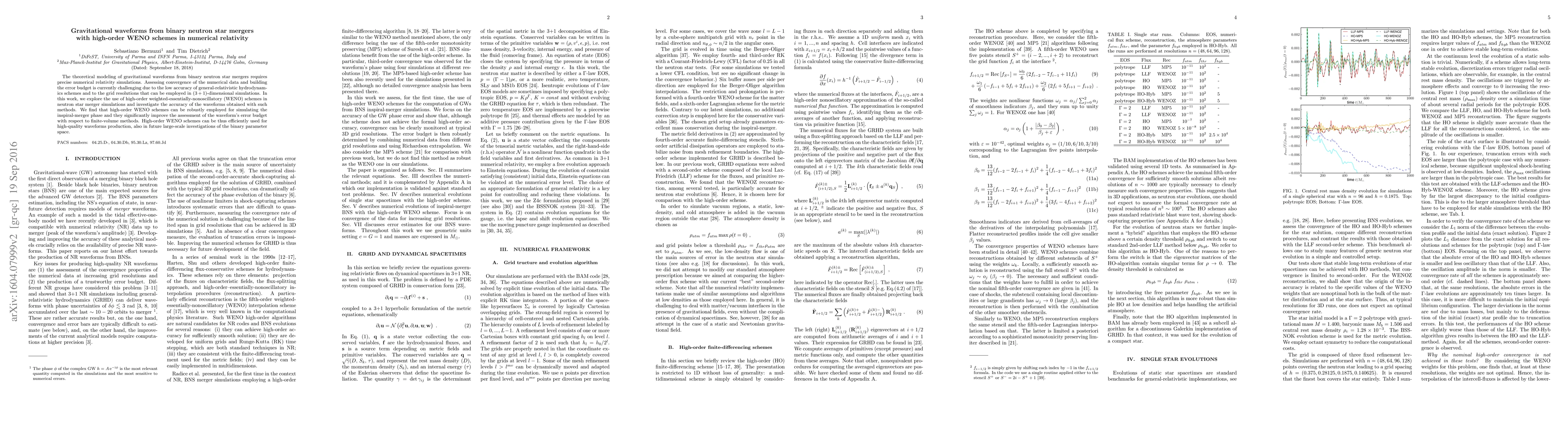 This paper explores the use of high-order weighted-essentially-nonoscillatory (WENO) schemes in numerical relativity to model gravitational waveforms from binary neutron star mergers, finding they significantly improve accuracy and error assessment compared to finite-volume methods. High-order WENO schemes are thus identified as effective for high-quality waveform production.